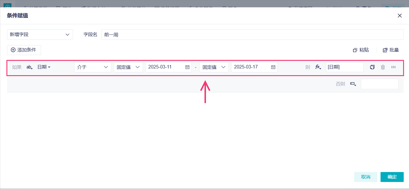 1)同样,使用「+>新增字段>条件赋值」获取前一周的日期。