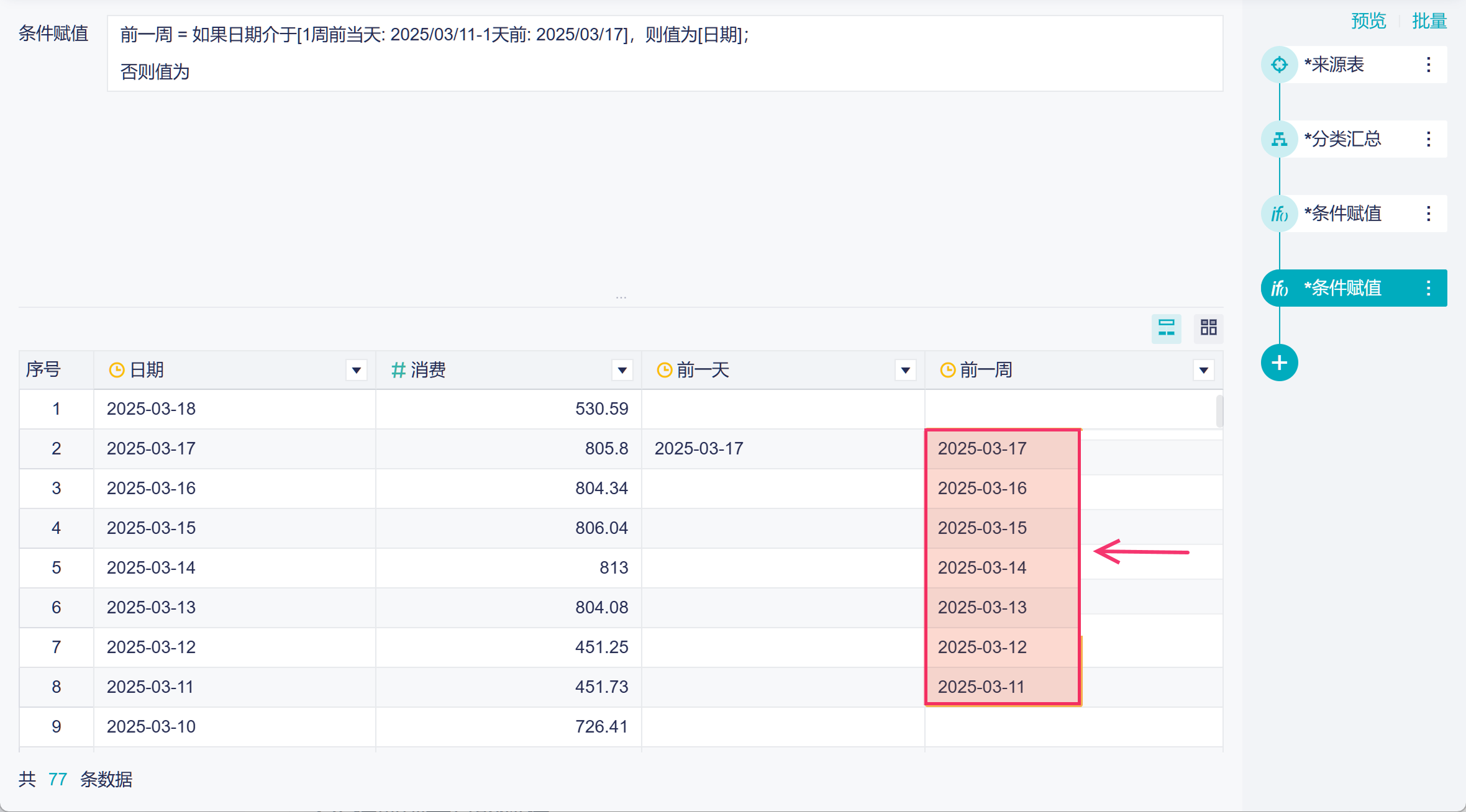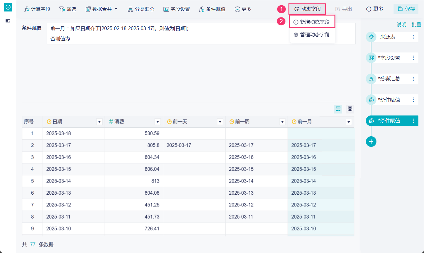 • 新增字段,使用条件赋值功能分别获取「前一天」、「前一周」、「前一月」的数据;