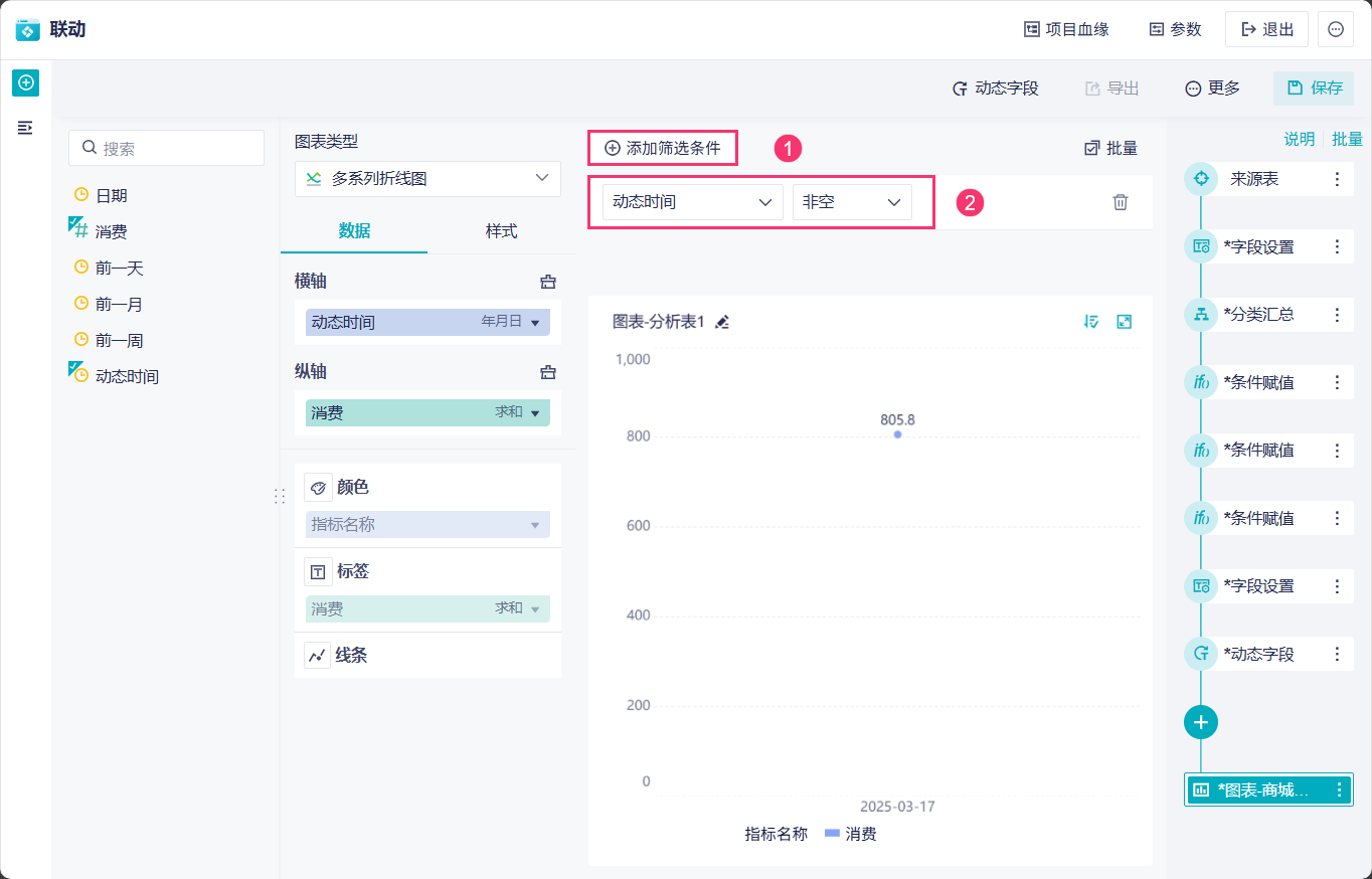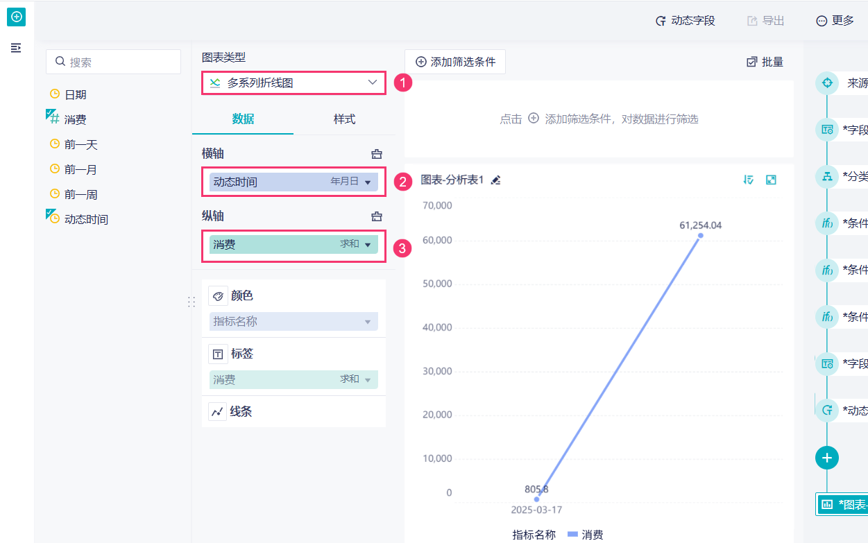 1)制作一个折线图,将「动态时间」字段拖入维度栏,将「消费」字段拖入指标栏,如下图所示: