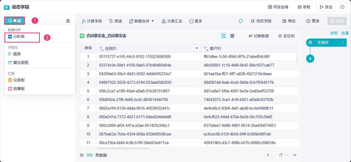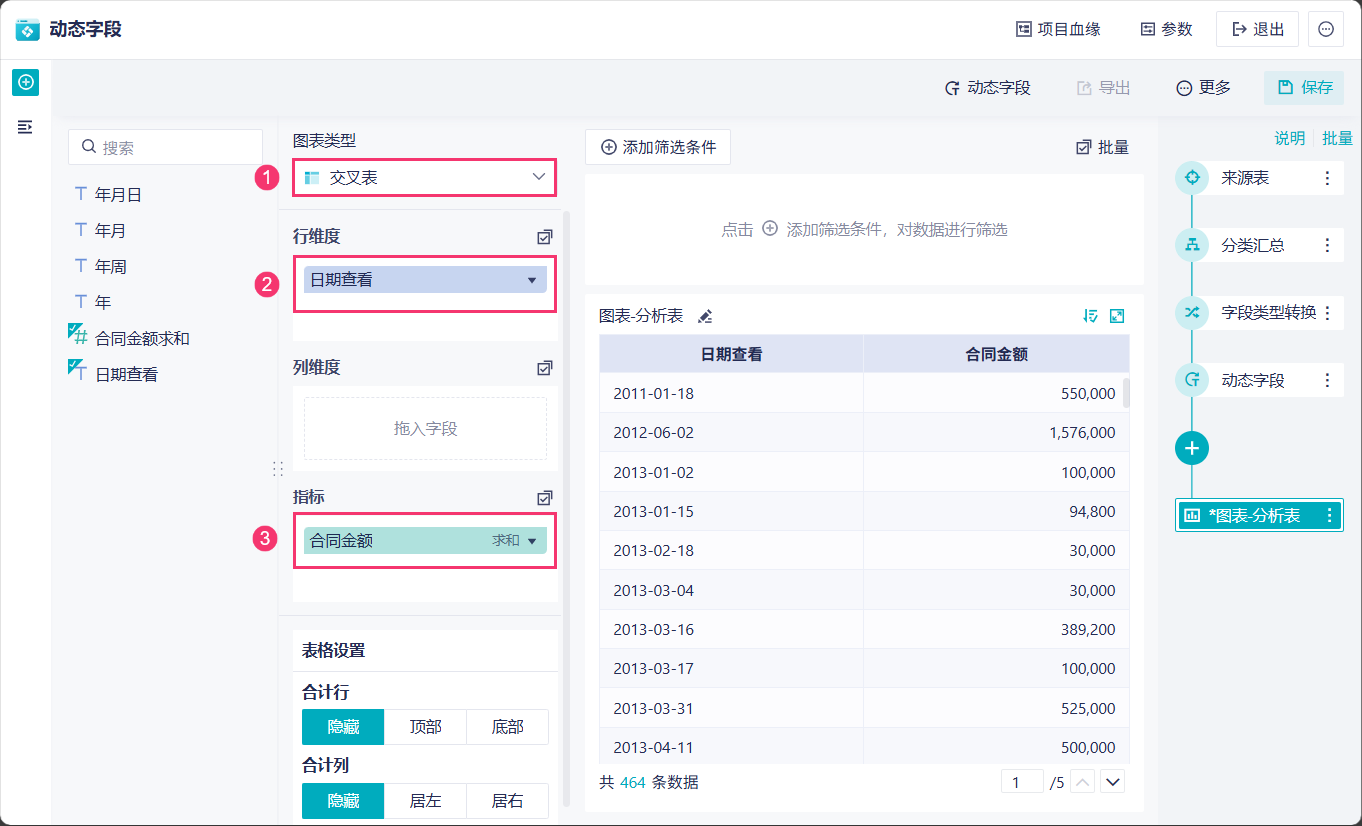 制作一个交叉表,使用动态字段「日期查看」。因为默认显示年月日字段,所以表格中的数据是不同年月日下的合同金额。如下图所示: