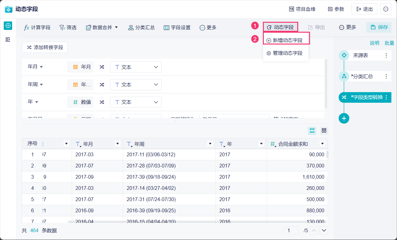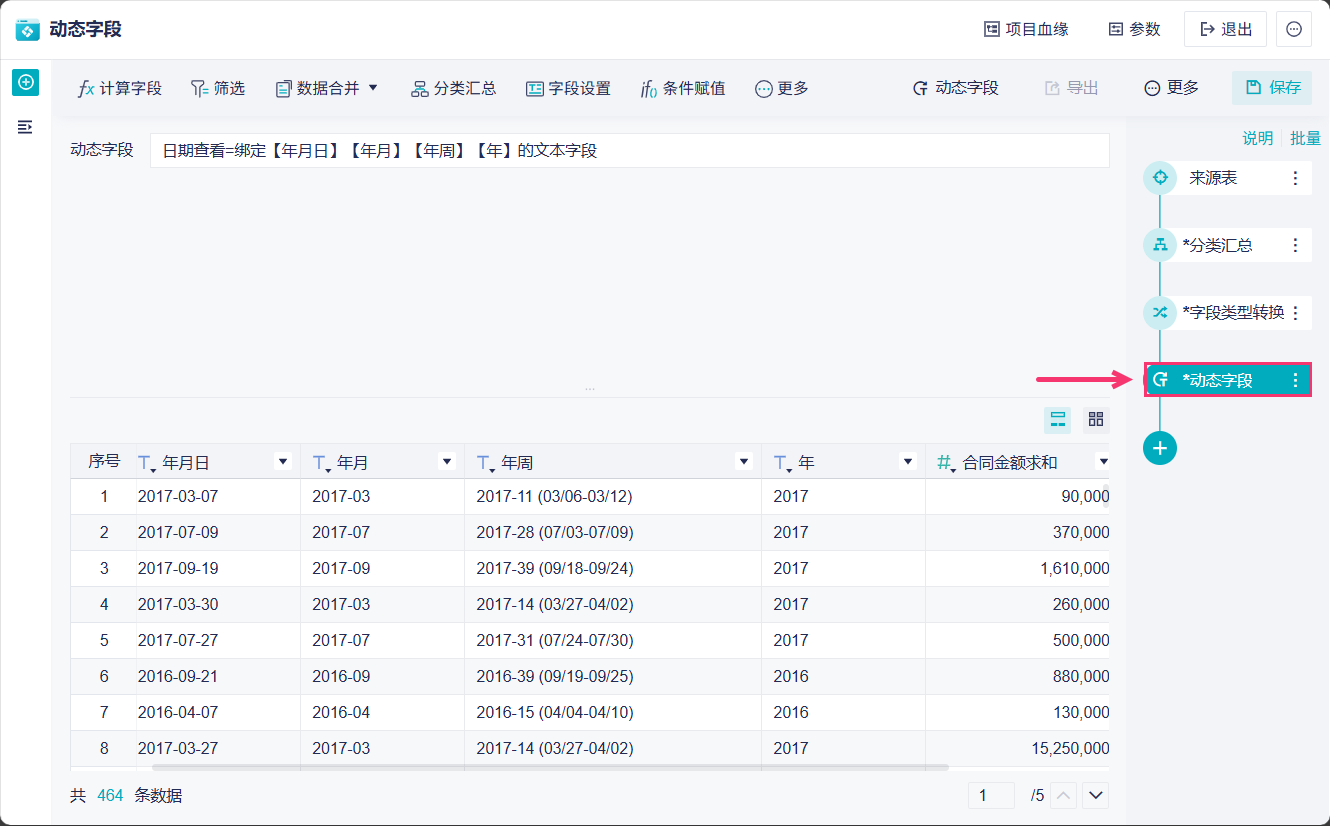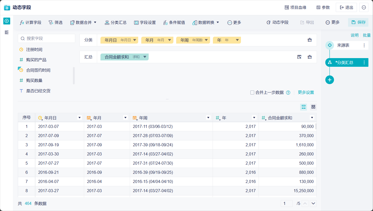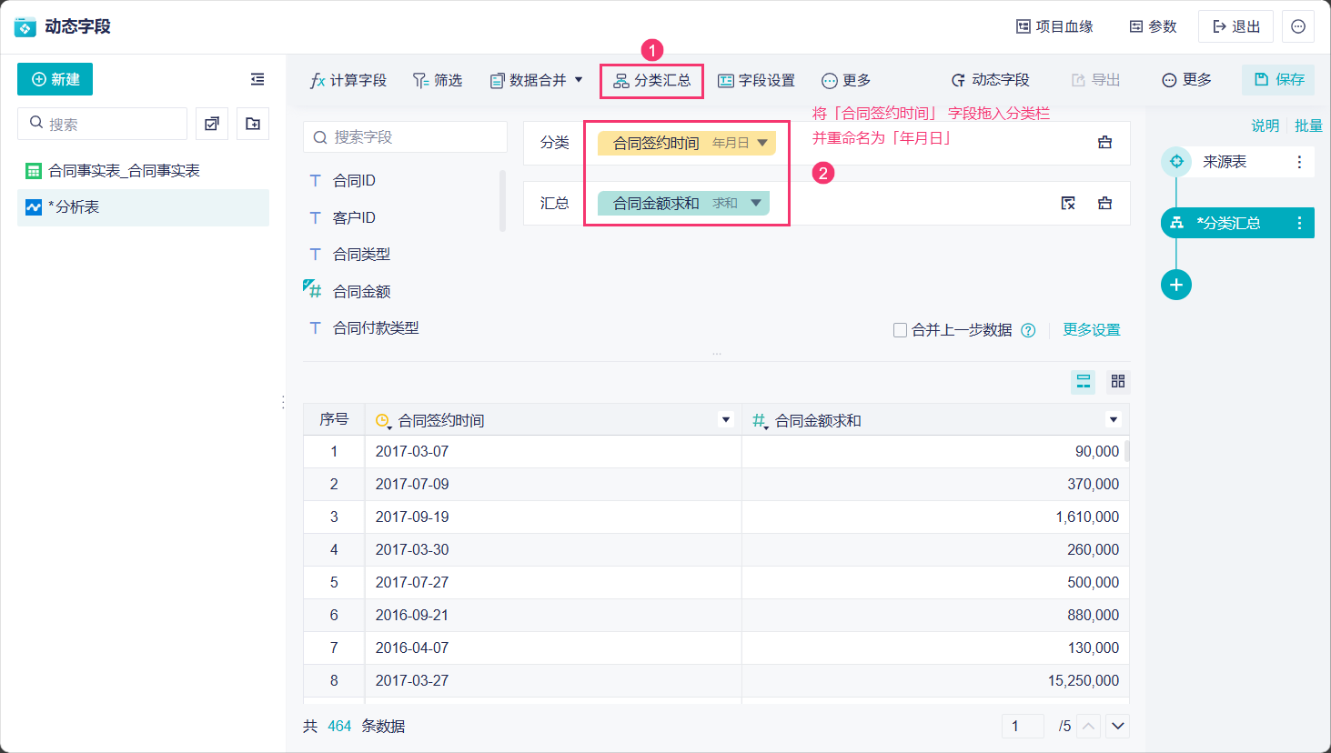 2)添加「分类汇总」步骤,将「合同签约时间」拖入分类栏,重命名为「年月日」;将「合同金额」拖入指标栏,如下图所示: