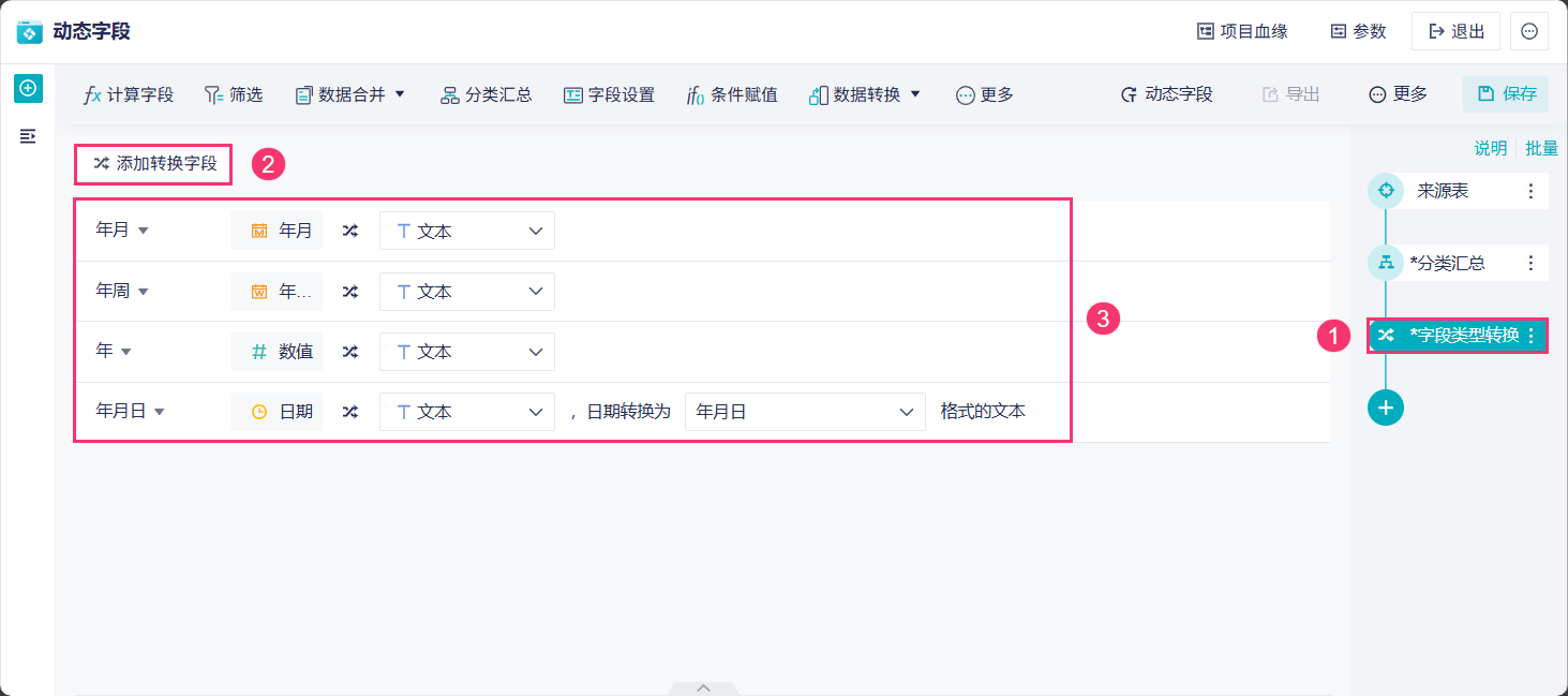 4)现在添加字段类型转换步骤,将这四个字段转化为「年月日、年月、年周、年」格式的文本,如下图所示: