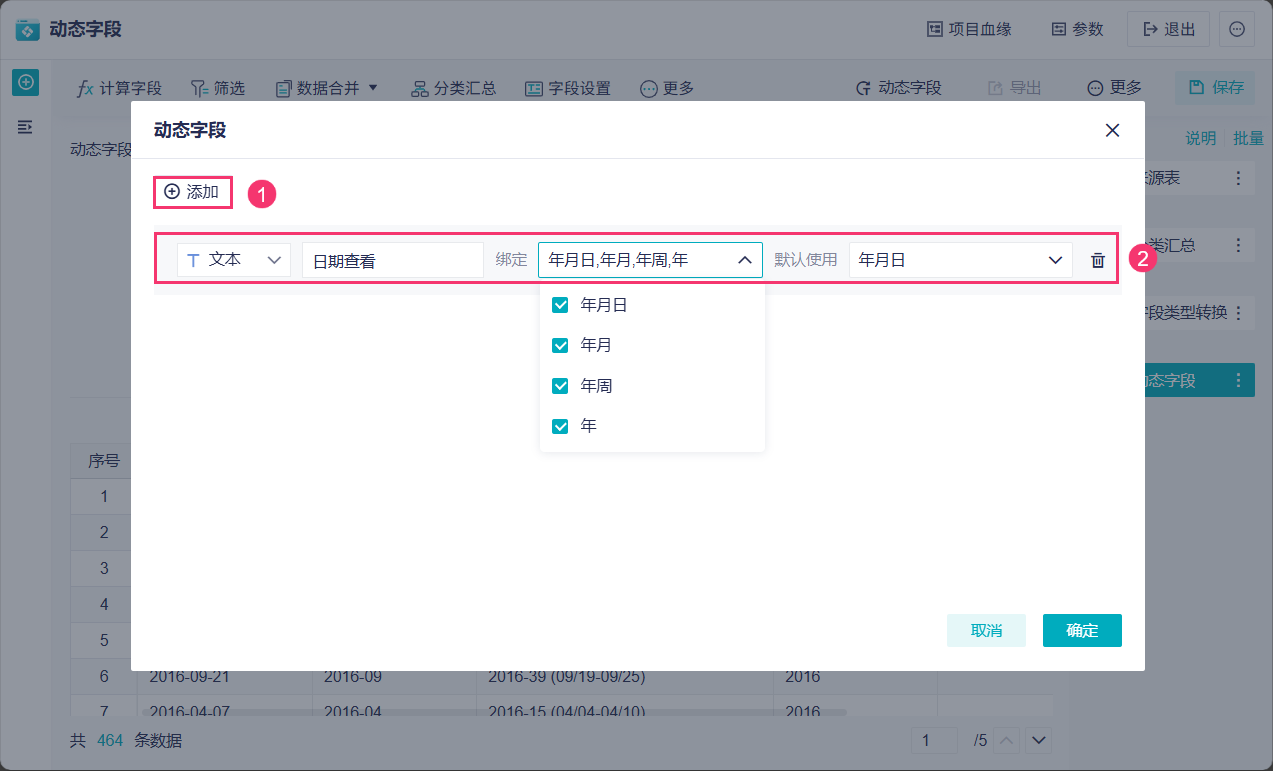 2)添加一个文本字段,命名为「日期查看」,并绑定「年月日、年月、年周、年」四个字段,默认使用年月日字段,如下图所示: