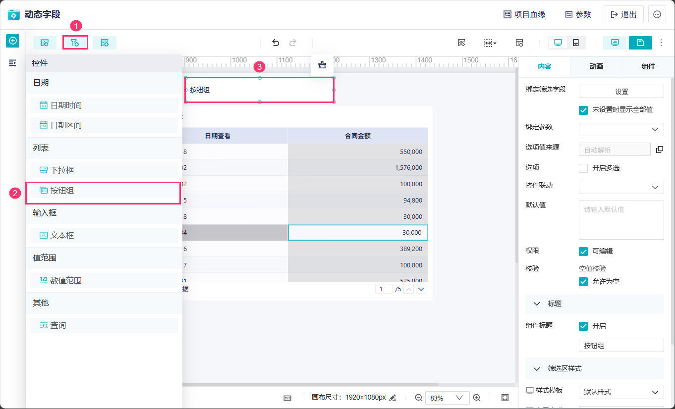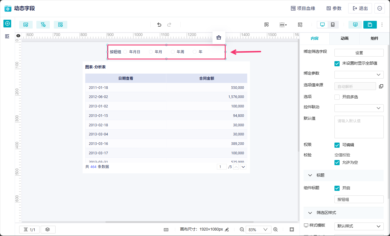 3)在按钮组中,就会展示动态字段所绑定的所有字段,如下图所示: