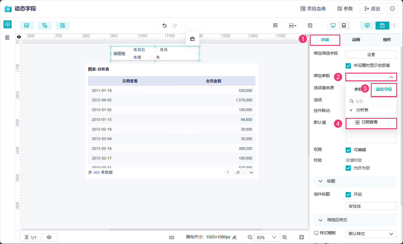 在仪表板中添加动态字段筛选器绑定动态字段。