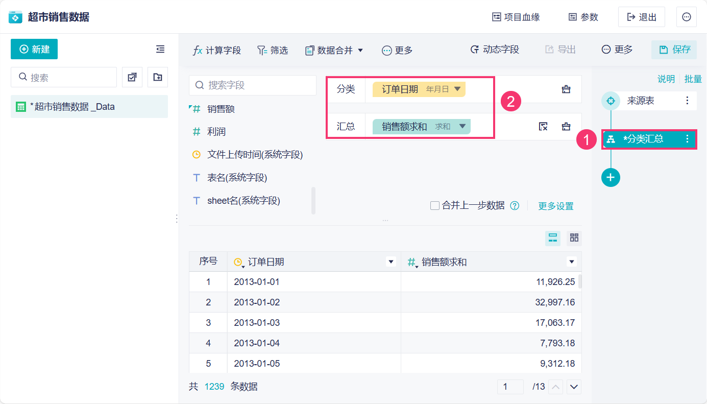 2)添加一个「分类汇总」步骤,将「订单日期」改为按照「年月」分组,求出每月的销售额总和。如下图所示: