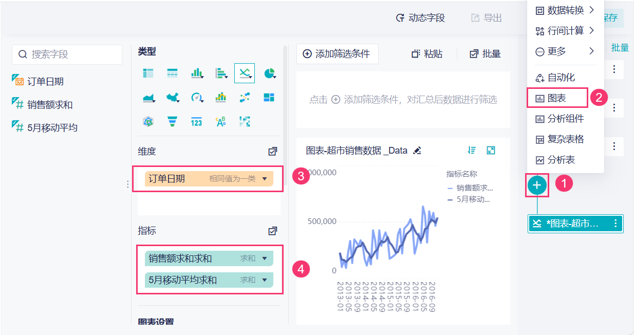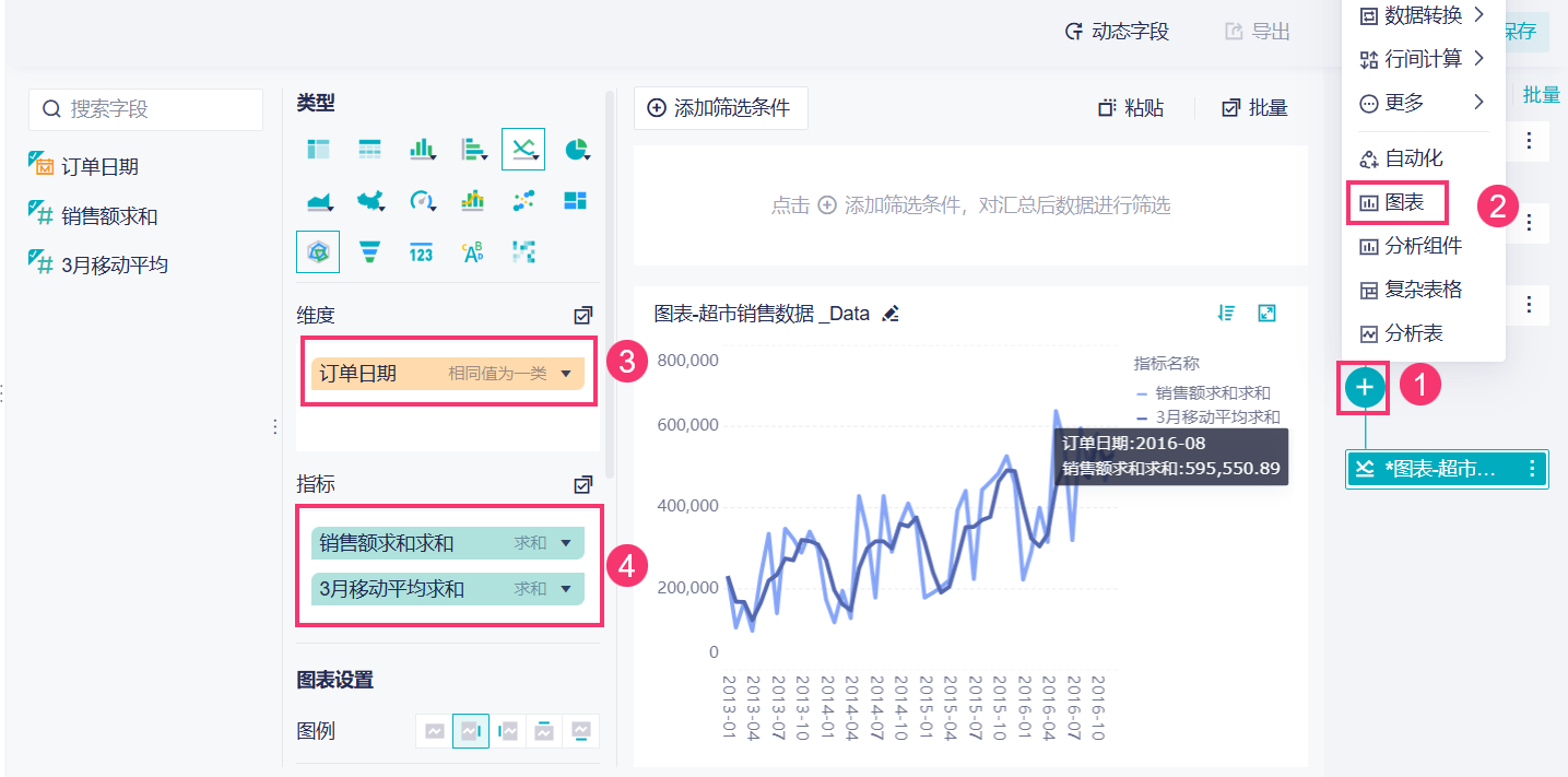 我们可以增加一个参数来进行行间计算,在仪表板中传递参数的值,实现动态计算移动平均的效果。