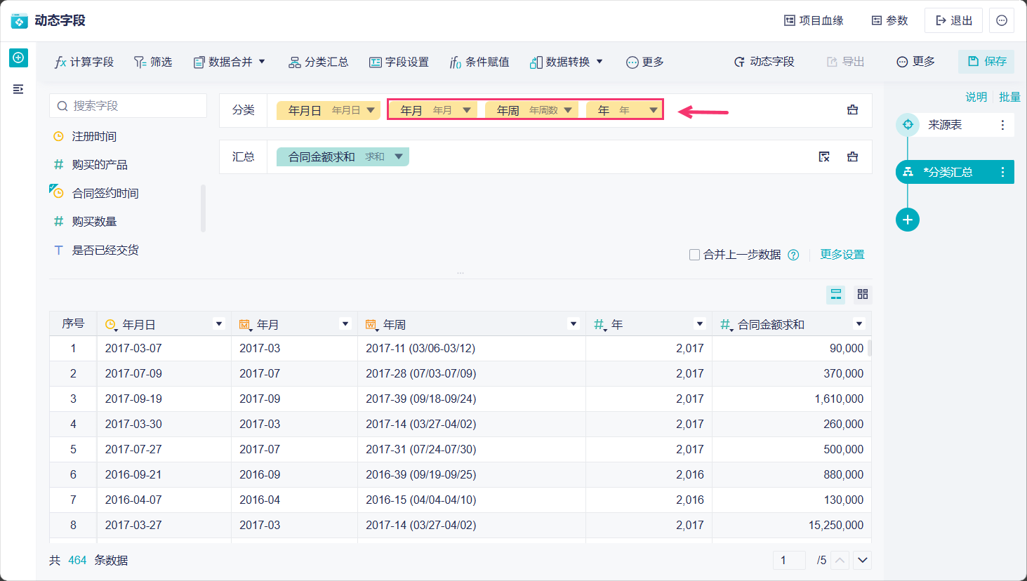 2)添加「分类汇总」步骤,将「合同签约时间」拖入分类栏,重命名为「年月日」;将「合同金额」拖入指标栏,如下图所示: