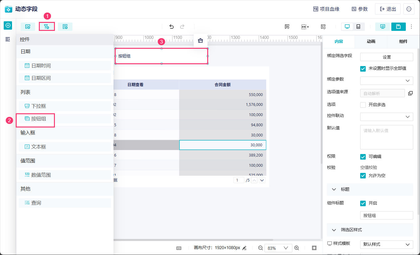 3)在按钮组中,就会展示动态字段所绑定的所有字段,如下图所示: