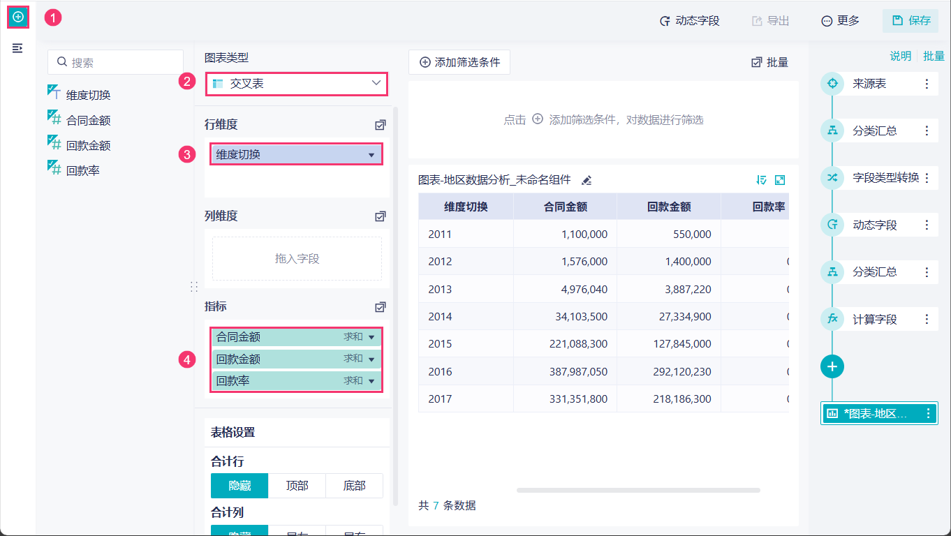 2)添加一个交叉表,展示每个维度下的合同金额、回款金额以及回款率。如下图所示: