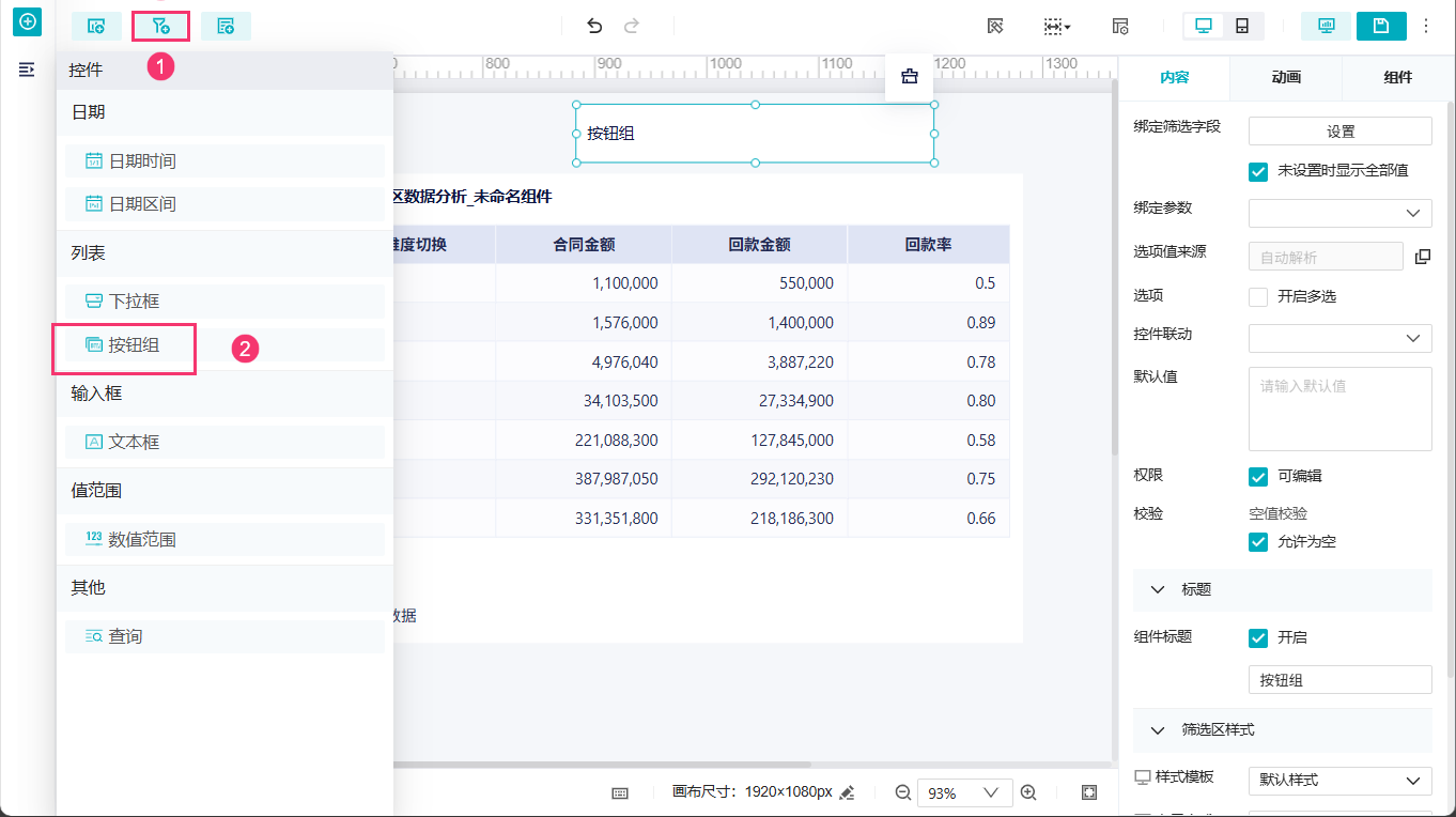 1)在仪表板中拖入制作的交叉表,再添加一个「按钮组」控件,如下图所示: