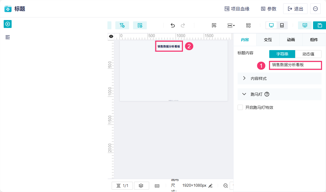 在右侧面板中,「组件标题」支持设置标题内容、内容样式、跑马灯特效等内容。