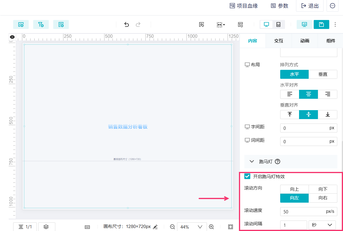 支持「开启跑马灯特效」,设置文字的滚动方向、滚动速度等,实现文字整体滚动的效果。如下图所示: