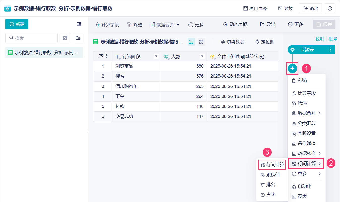 2)点击「+>行间计算>行间计算」,利用这个分析步骤来实现错行取数。