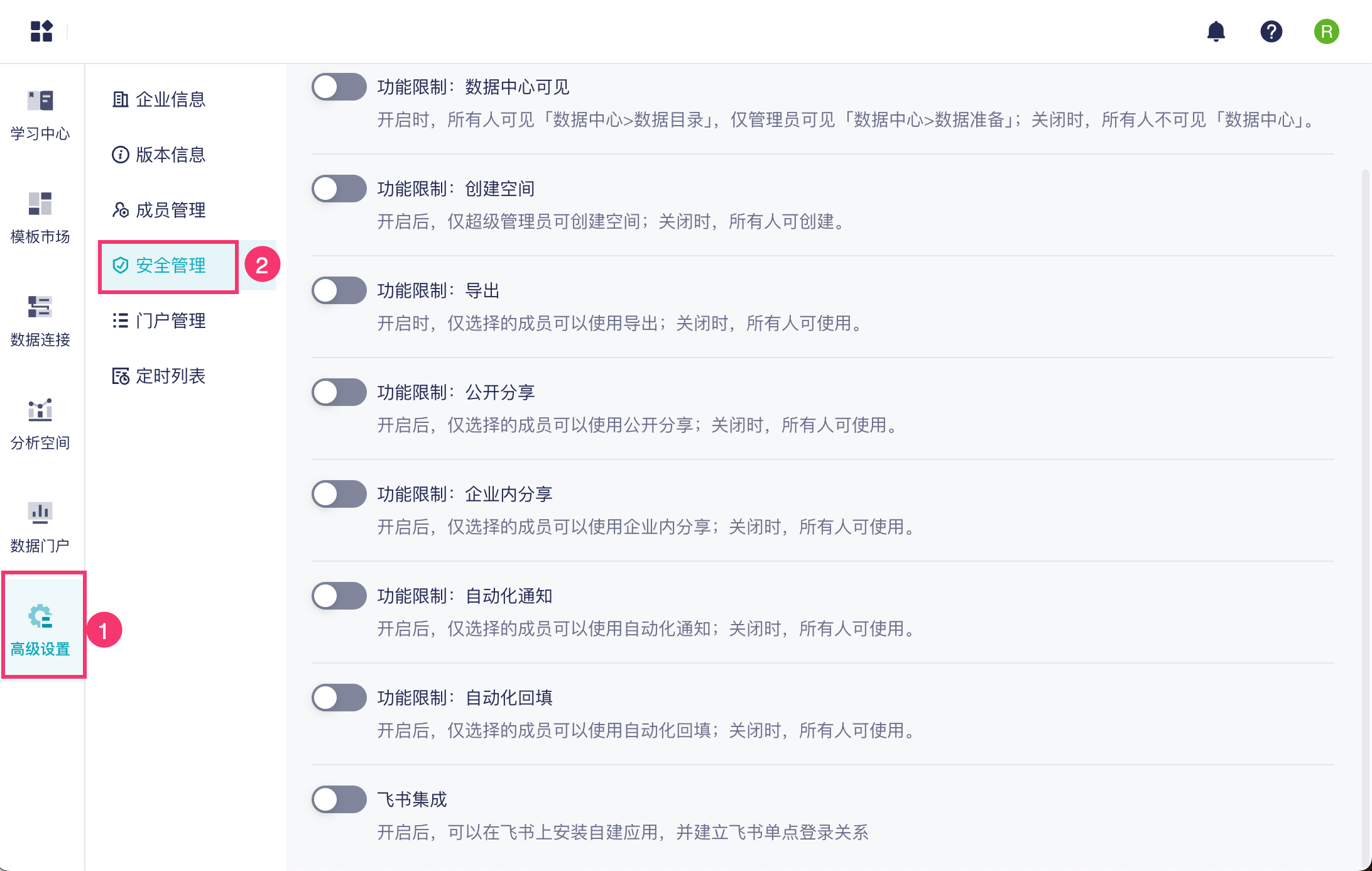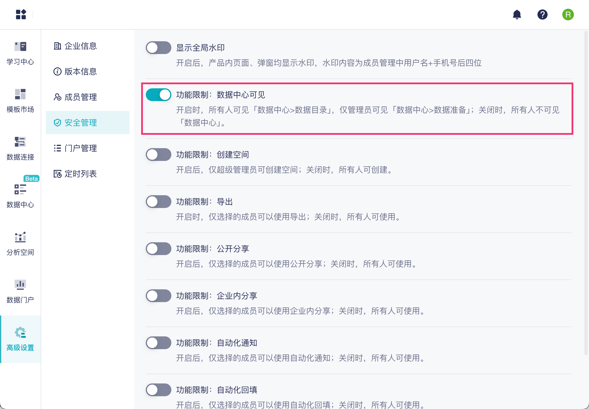 | 功能限制 | 数据中心可见 | 开启时,所有人可见「数据中心>数据目录」,仅管理员可见「数据中心>数据准备」;关闭时,所有人不可见「数据中心」。 |