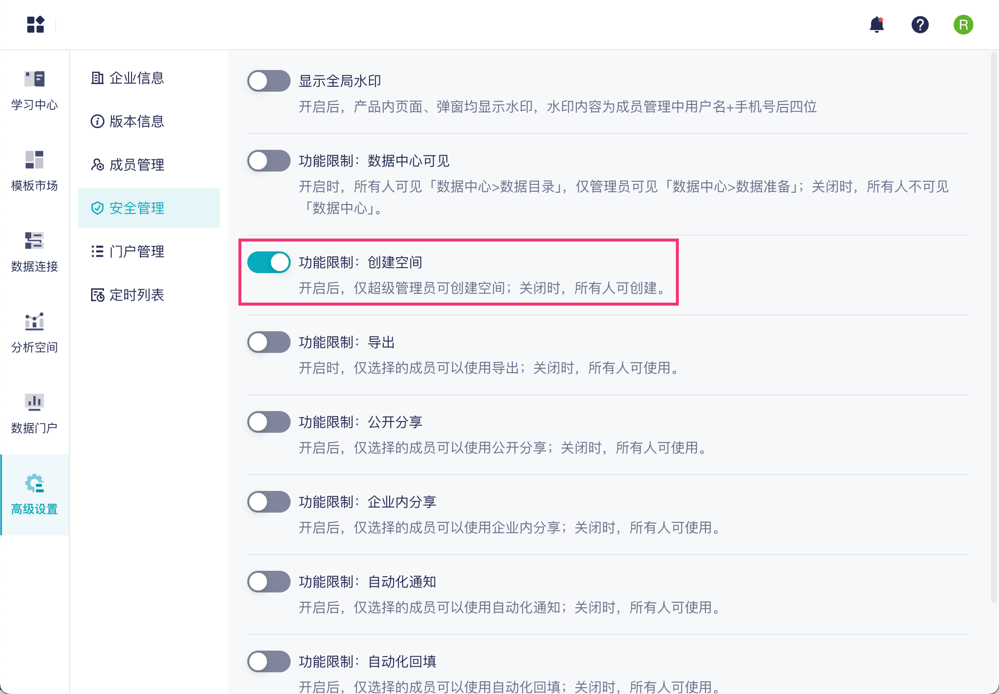 | 创建空间 | 开启后,仅超级管理员可创建空间;关闭时,所有人可创建。 | |