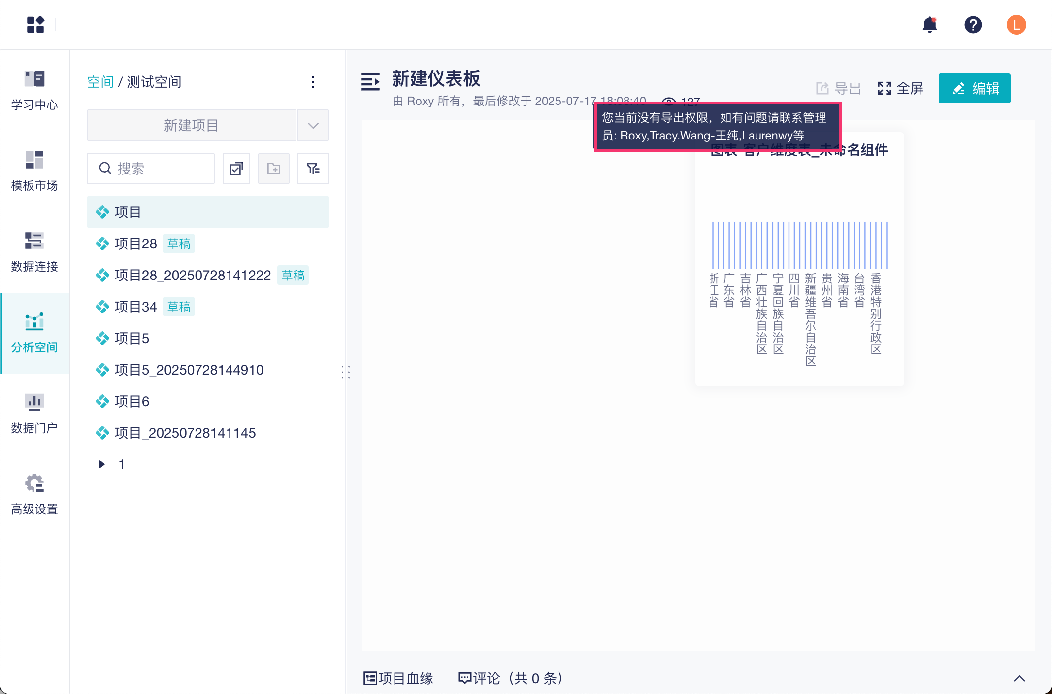 3)有导出权限的成员,可以正常导出分析表或者看板。没有导出权限的成员,导出按钮灰化,不可导出数据。如下图所示: