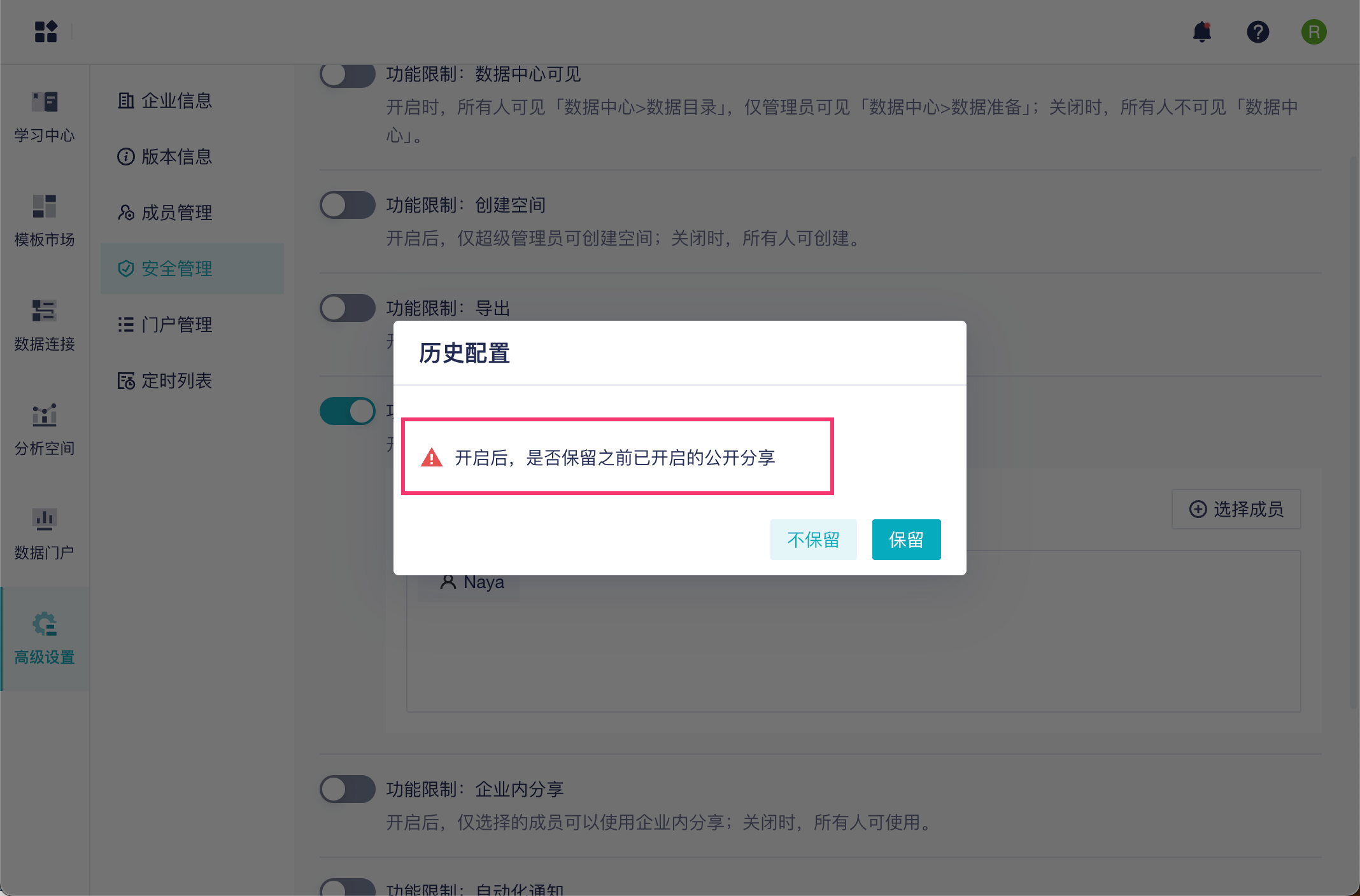 不保留:企业内已开启的「公开分享/企业内分享」配置全部关闭;