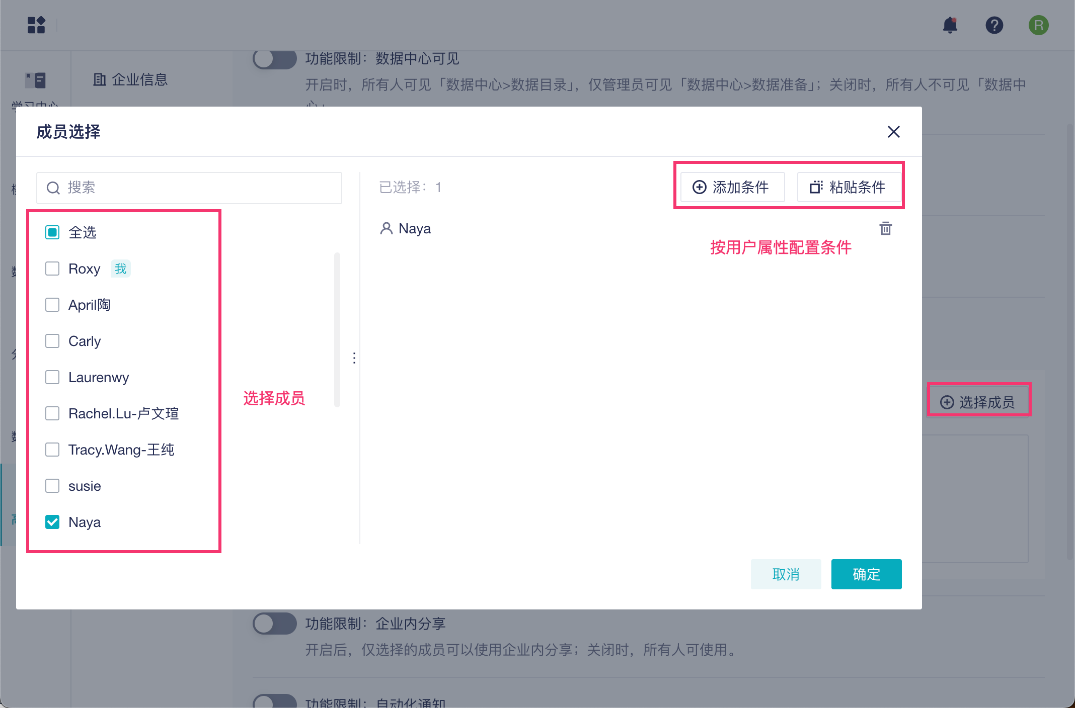 2)点击「选择成员」,在弹窗中可以选择具体的成员,也可以自定义设置条件: