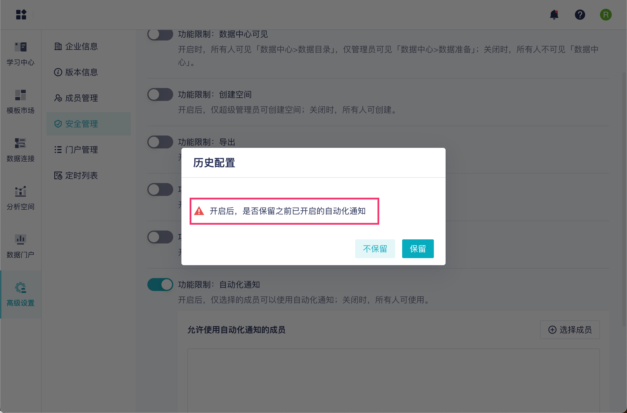 「功能限制-自动化通知」可以对当前企业成员能否使用「自动化通知」功能进行控制。