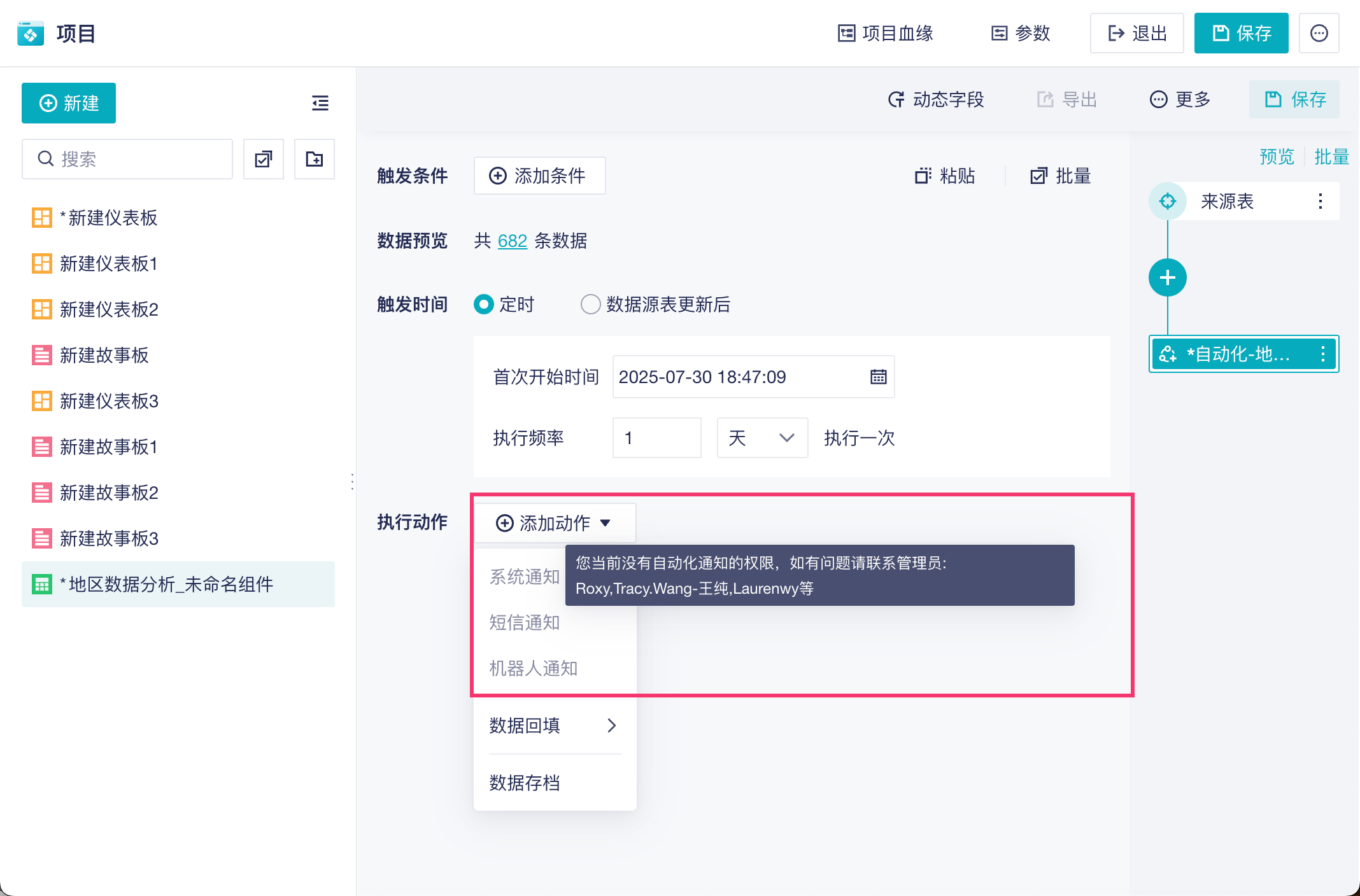 3)未被选择的用户在分析表中使用「自动化功能」时,提示没有权限,如下图所示: