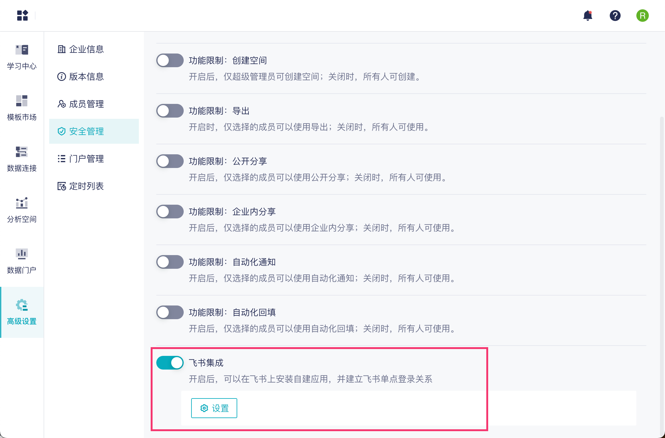 | 飞书集成 | 开启后,可以在飞书上安装自建应用,并建立飞书单点登录关系。 | |