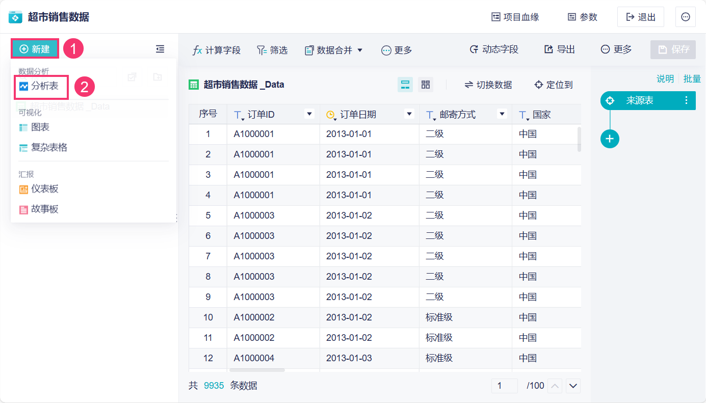 1)下载示例数据并 上传 到本产品中,将数据保存在项目中,进入编辑页面,创建一张分析表。如下图所示: