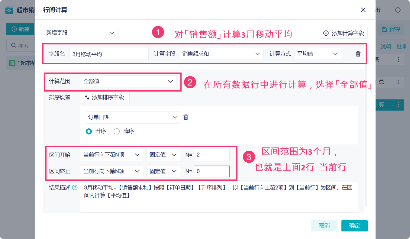 4)按照下图进行配置,即可计算出 3 月移动平均。如下图所示: