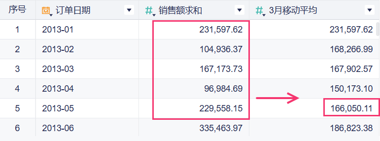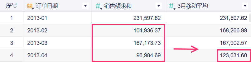 5)以 2013 年 4 月为例,移动平均值为 (2013 年 2 月销售额+ 2013 年 3 月销售额 +2013 年 4 月销售额)/3。如下图所示: