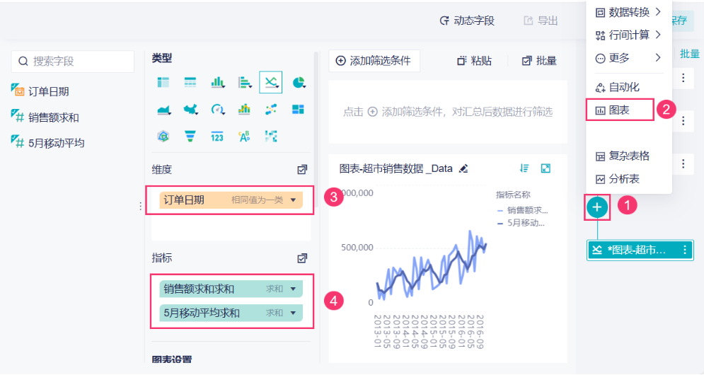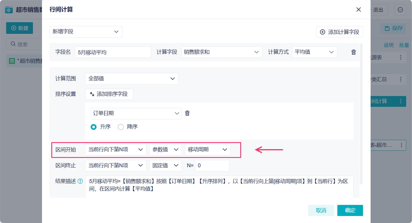 我们可以增加一个参数来进行行间计算,在仪表板中传递参数的值,实现动态计算移动平均的效果。
