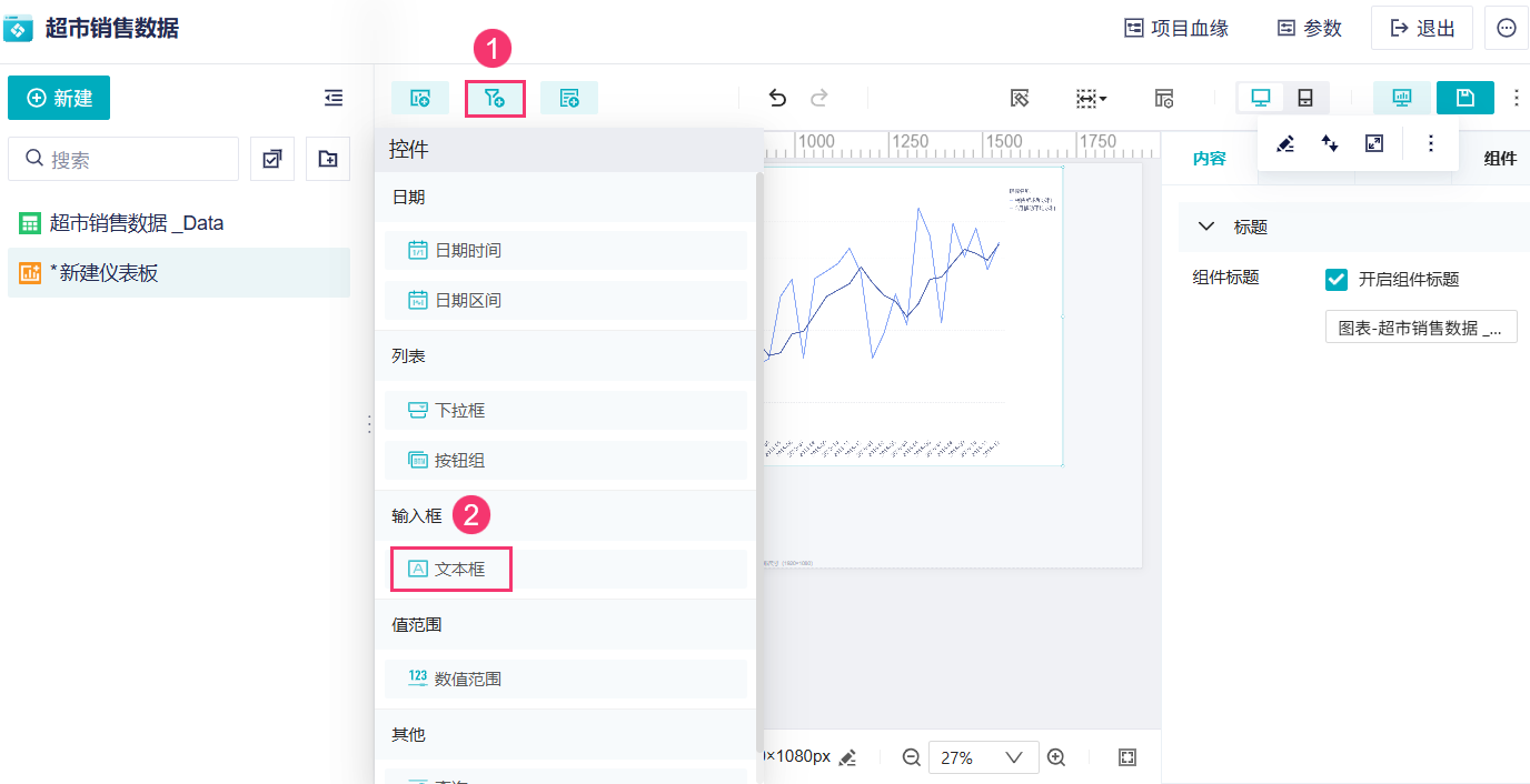 1)新建一张仪表板,把折线图拖入仪表板中。并在仪表板中增加一个「文本框」控件,如下图所示: