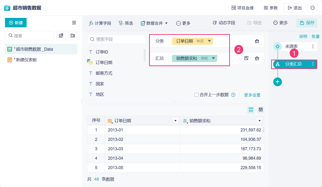 2)添加一个「分类汇总」步骤,将「订单日期」改为按照「年月」分组,求出每月的销售额总和。如下图所示: