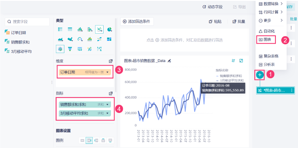 若计算时间移动平均,建议数据包含 连续非重复日期 和对应销量;若日期缺失,请先使用「补全缺失值」进行补全;