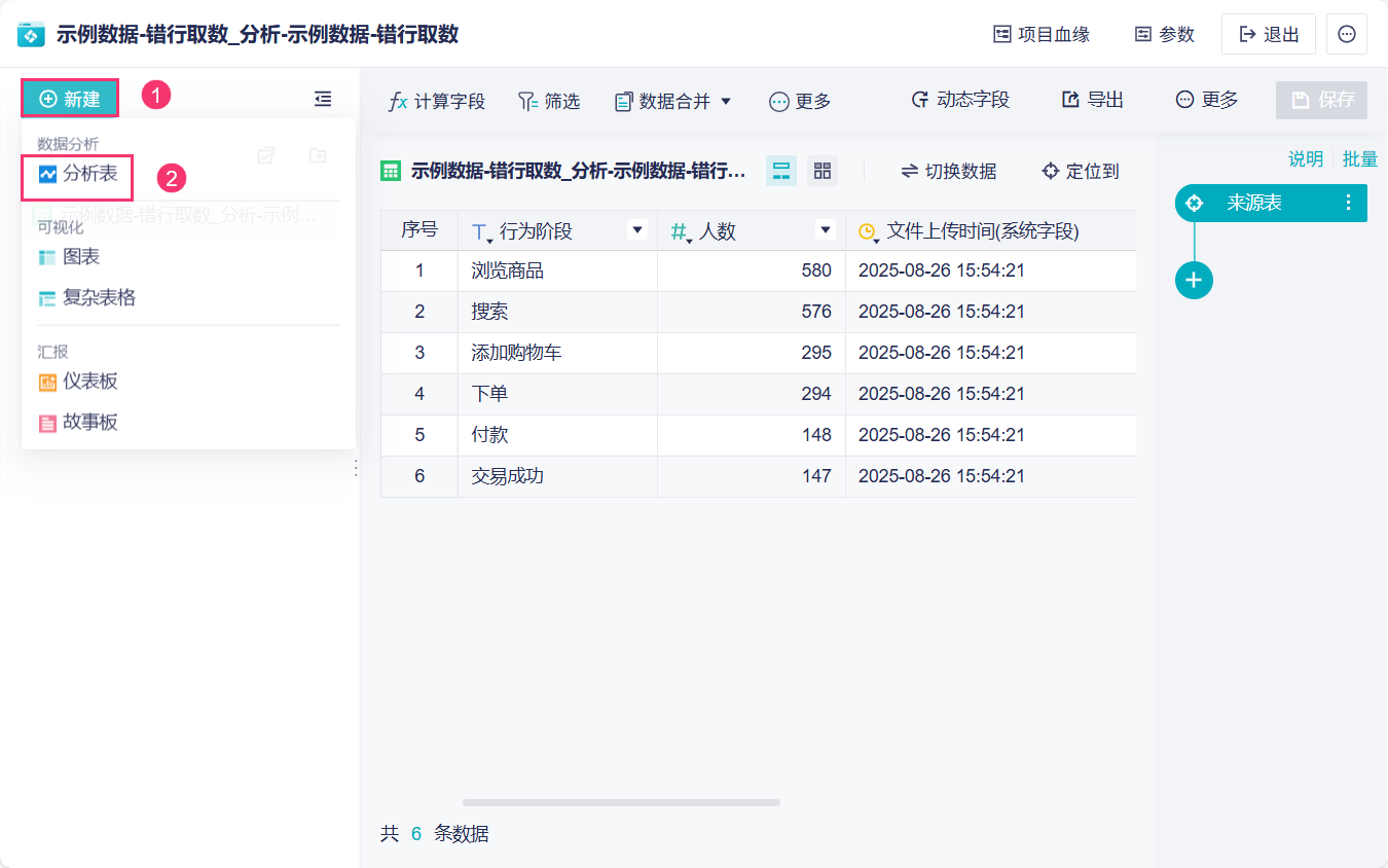 1)下载示例数据并 上传 到本产品中,将数据保存在项目中,进入编辑页面,创建一张分析表。如下图所示: