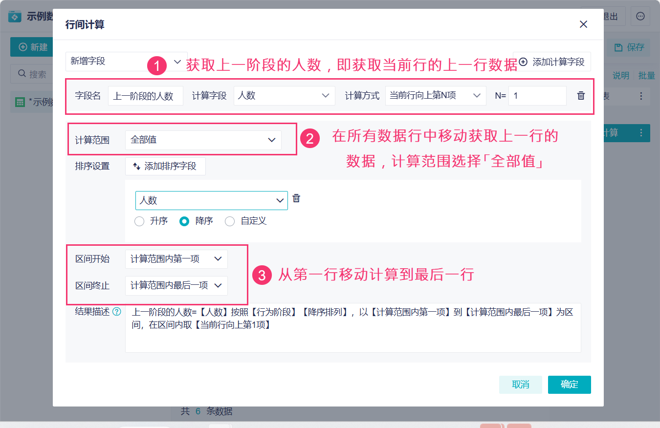 3)在弹窗中进行相关的配置,可以获取当前行上一行的数据。同理,可以获取当前行前 2 行的数据、前 3 行的数据......
