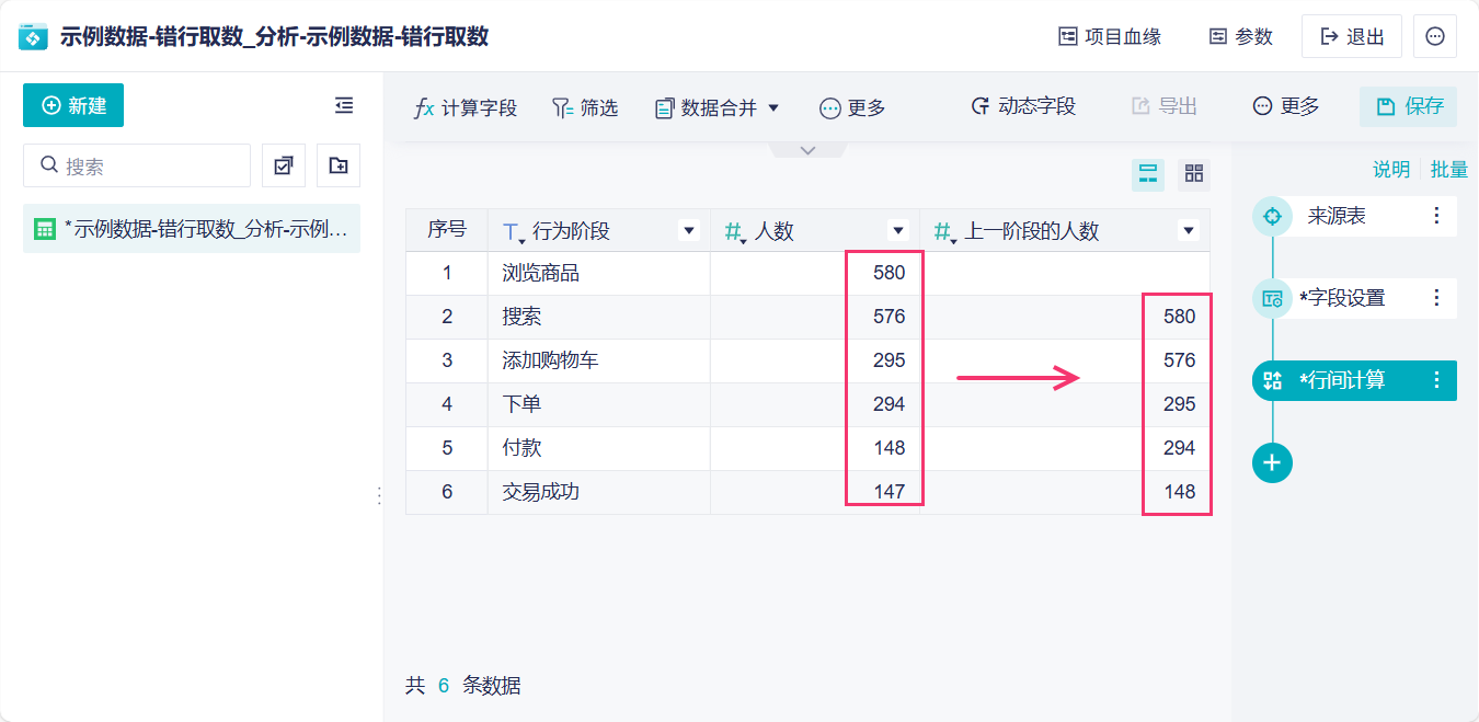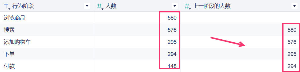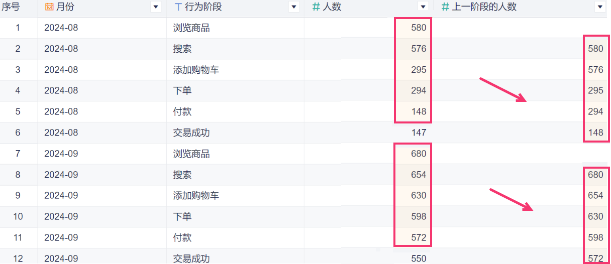 例如在电商分析中,想要计算各阶段的转化率,需要获取上一阶段的数据,再进行计算。