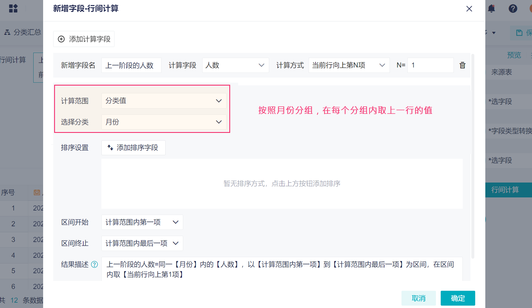 2)在弹窗中,将「计算范围」改为分类值,并按照「月份」分组。那么就是在每月分组内,寻找上一行的数据。如下图所示: