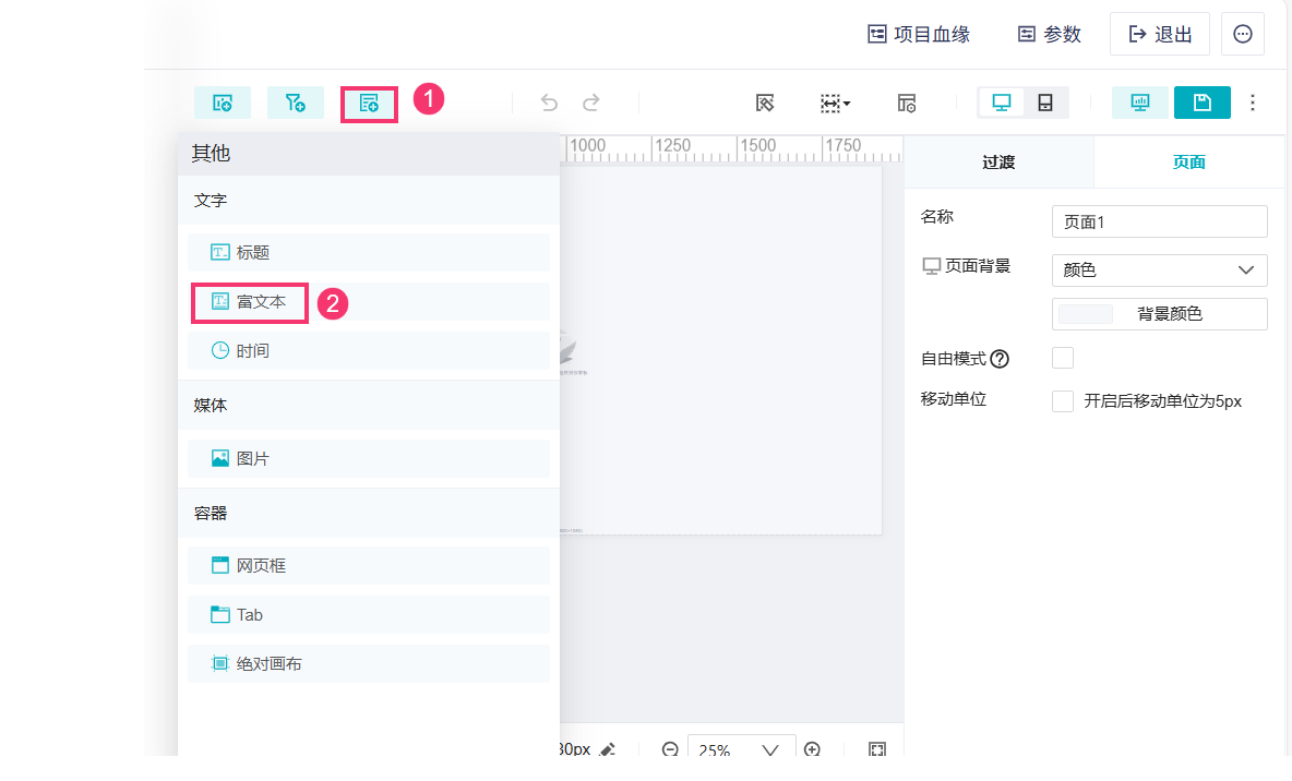 1)点击功能栏「其他>富文本」,将其添加到页面中。如下图所示: