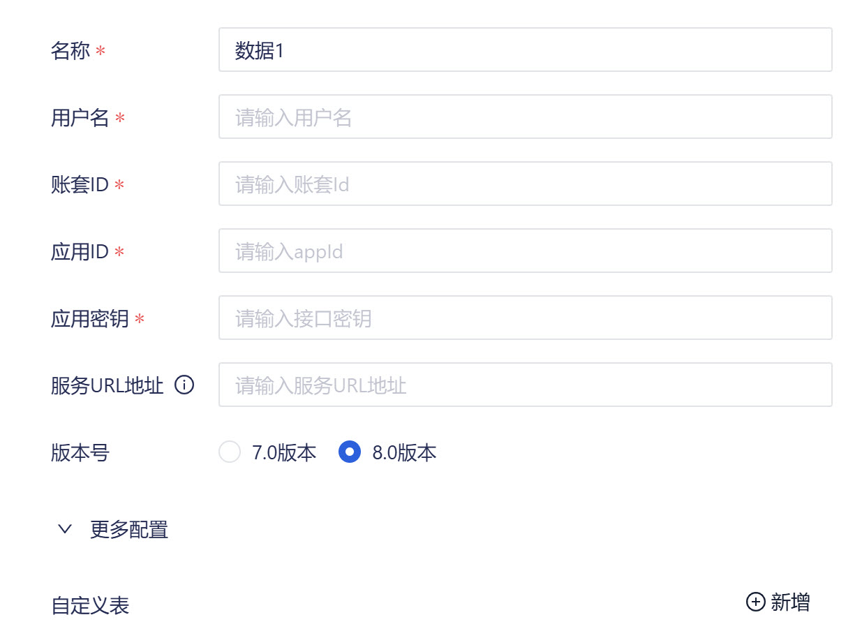 | 定义 | 由帆软封装的请求方式,在数据连接页面填写第 2 节获取的用户名、账套ID等基础配置信息后,自动获取的表,可点击 平台/表/字段 查看