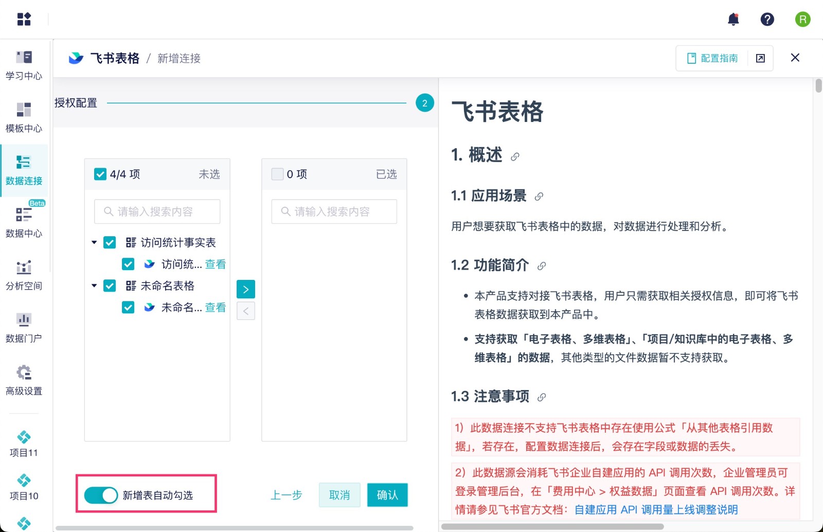由于数据源的不断迭代,可获取的数据表会逐渐增多。若用户希望自动获取新增的表,可在选表界面开启「新增表自动勾选」。如下图所示: