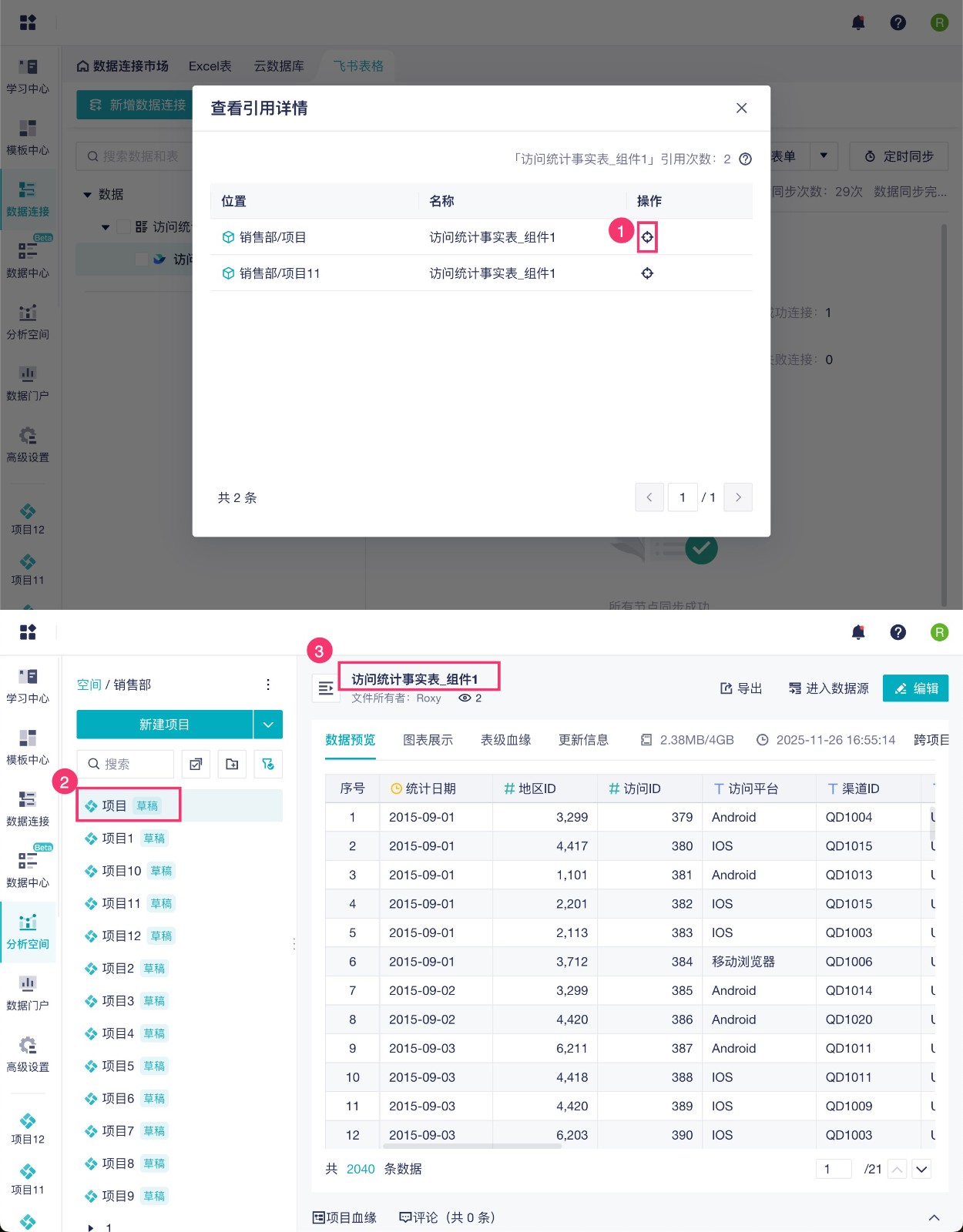 若用户想要查看该数据表被引用的情况,并且直接一键定位到直接引用该表的分析表所在项目中,则可以使用该功能。
