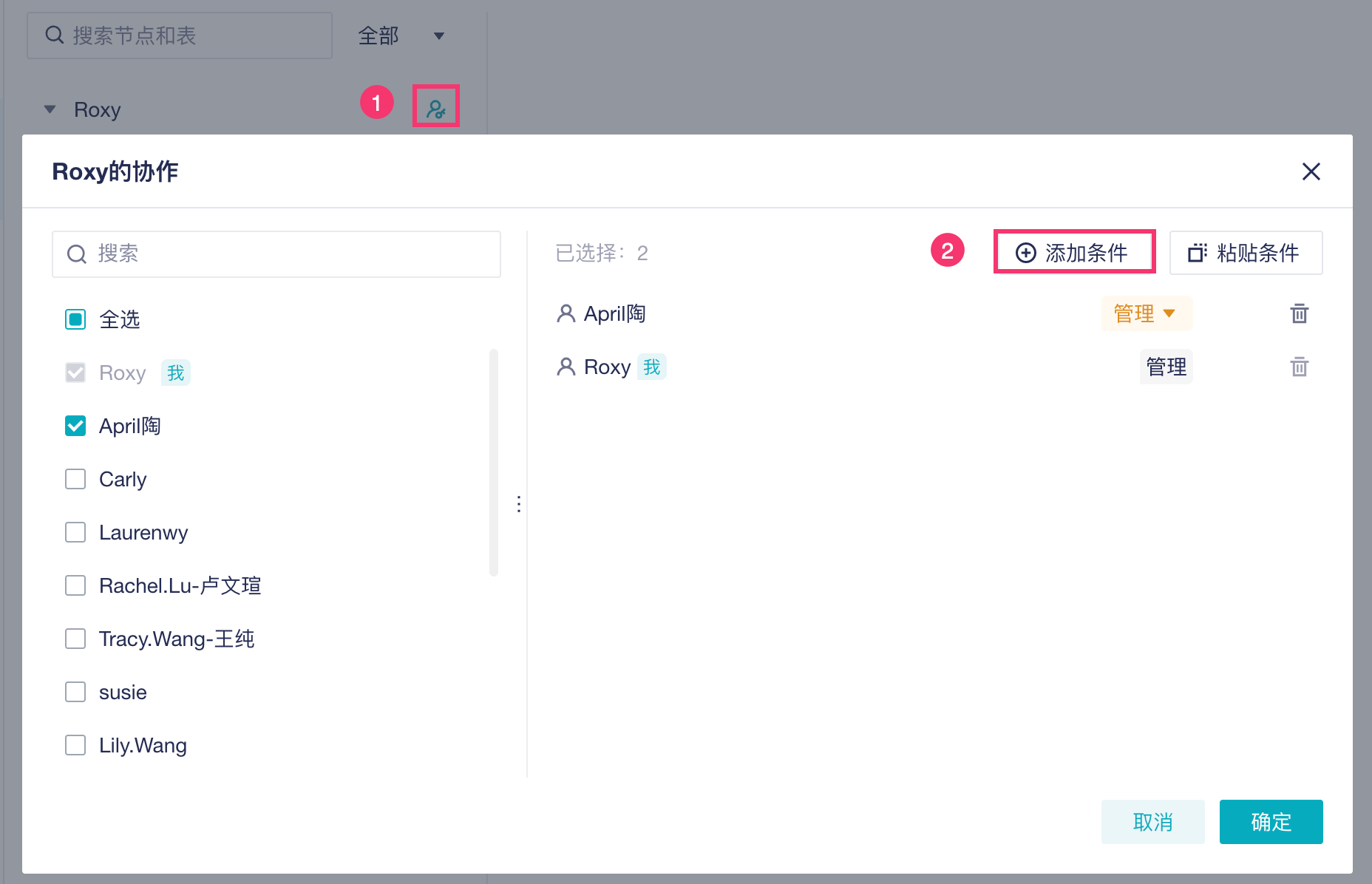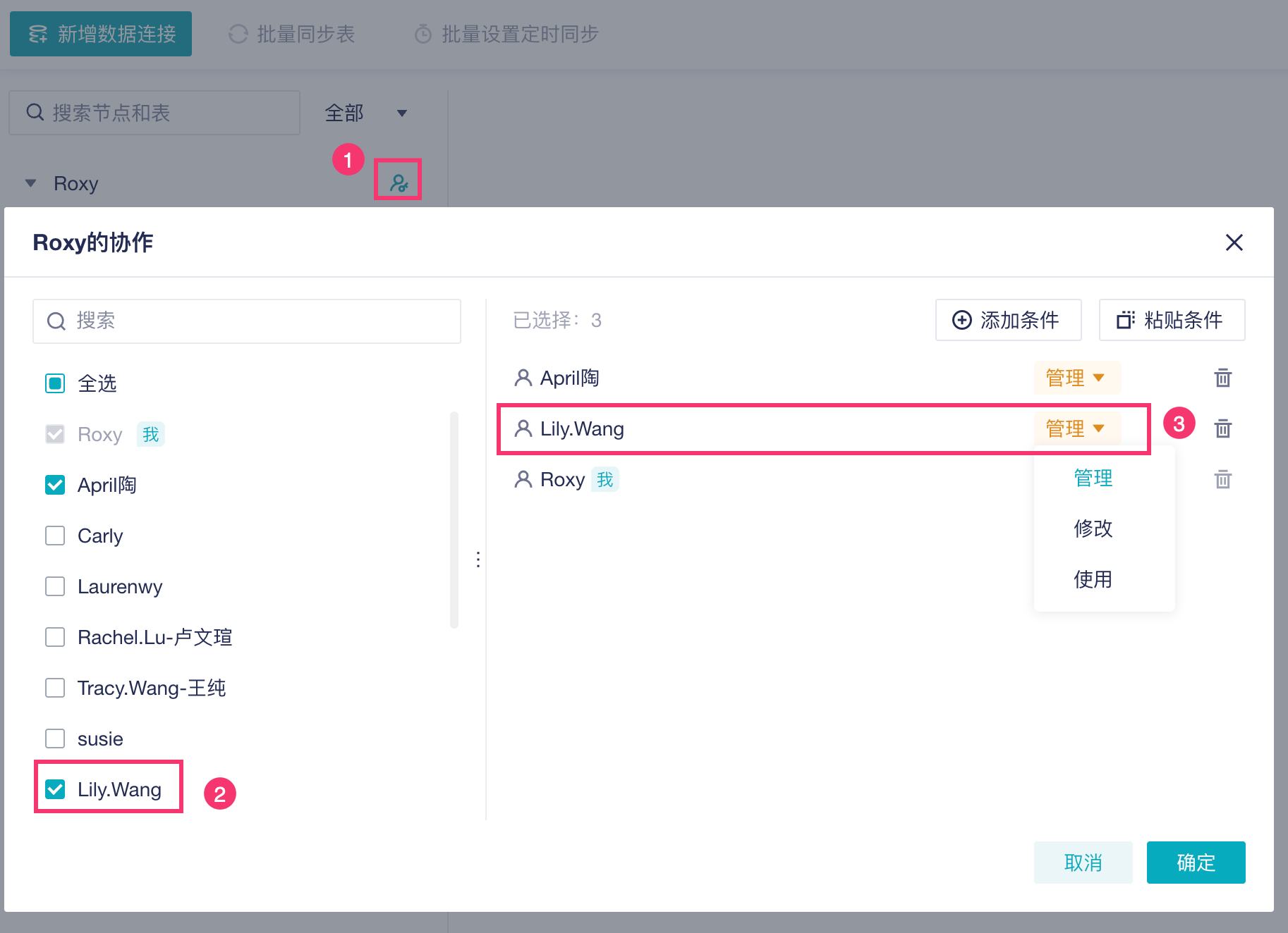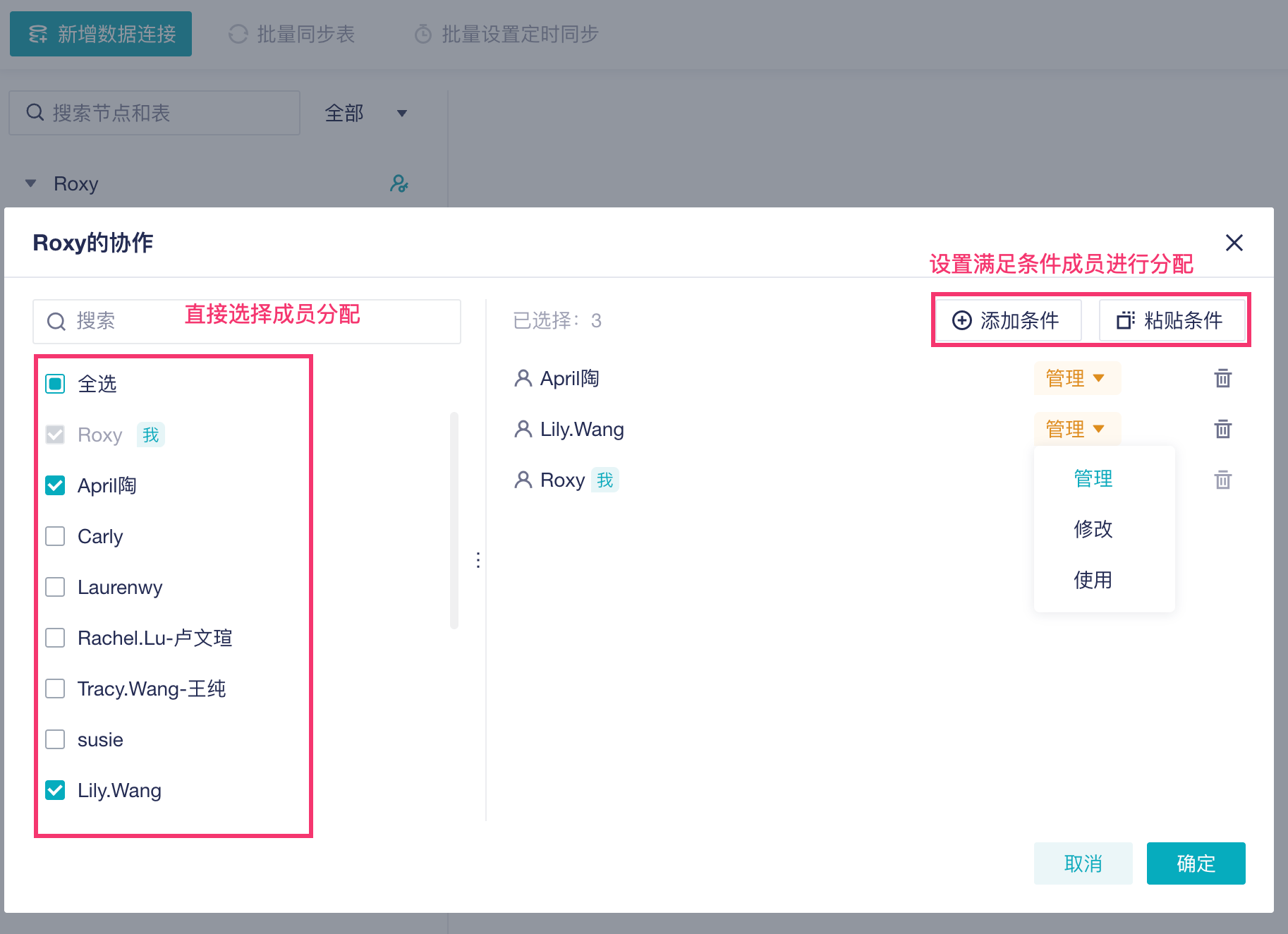 以数据源协作为例,需要将某一个分组的数据协作给 Lily.Wang。在设置弹窗中,勾选成员 Lily.Wang,再分配管理权限。设置好后,点击确定即可。如下图所示: