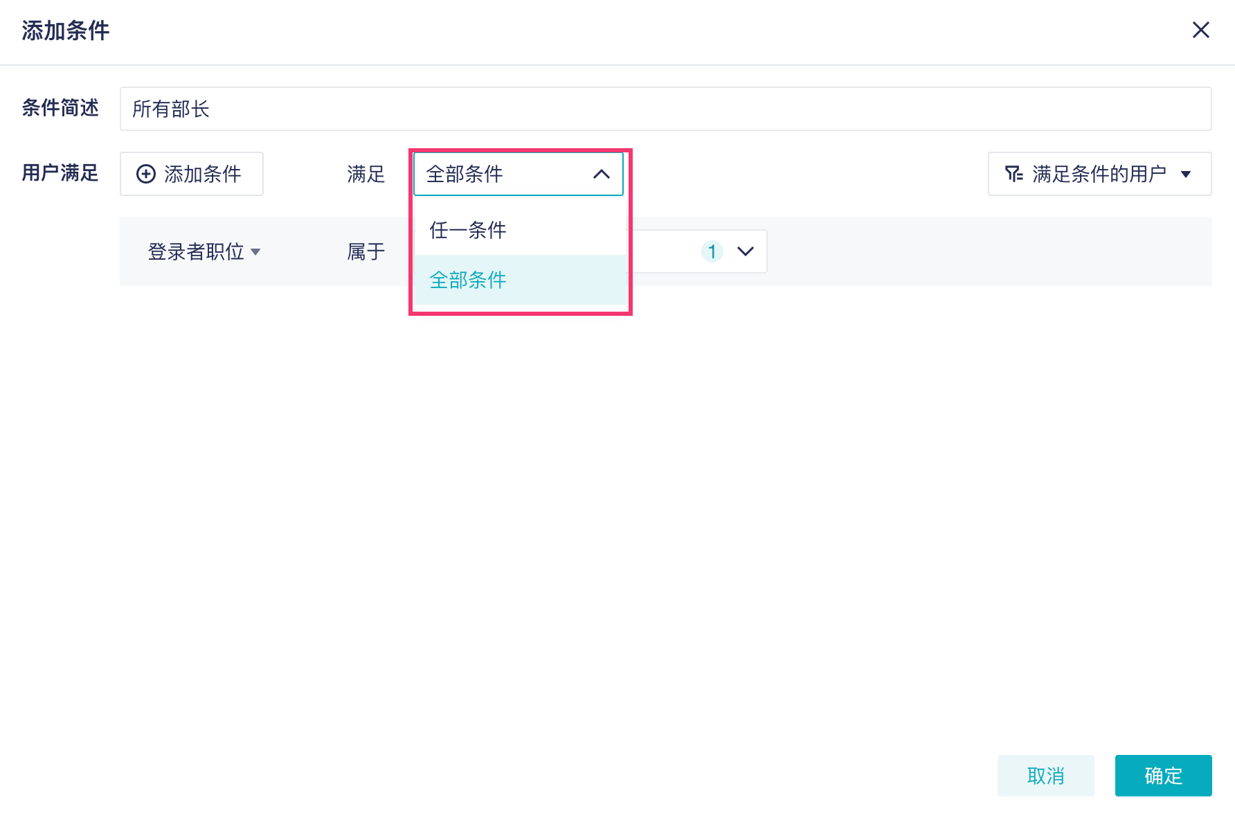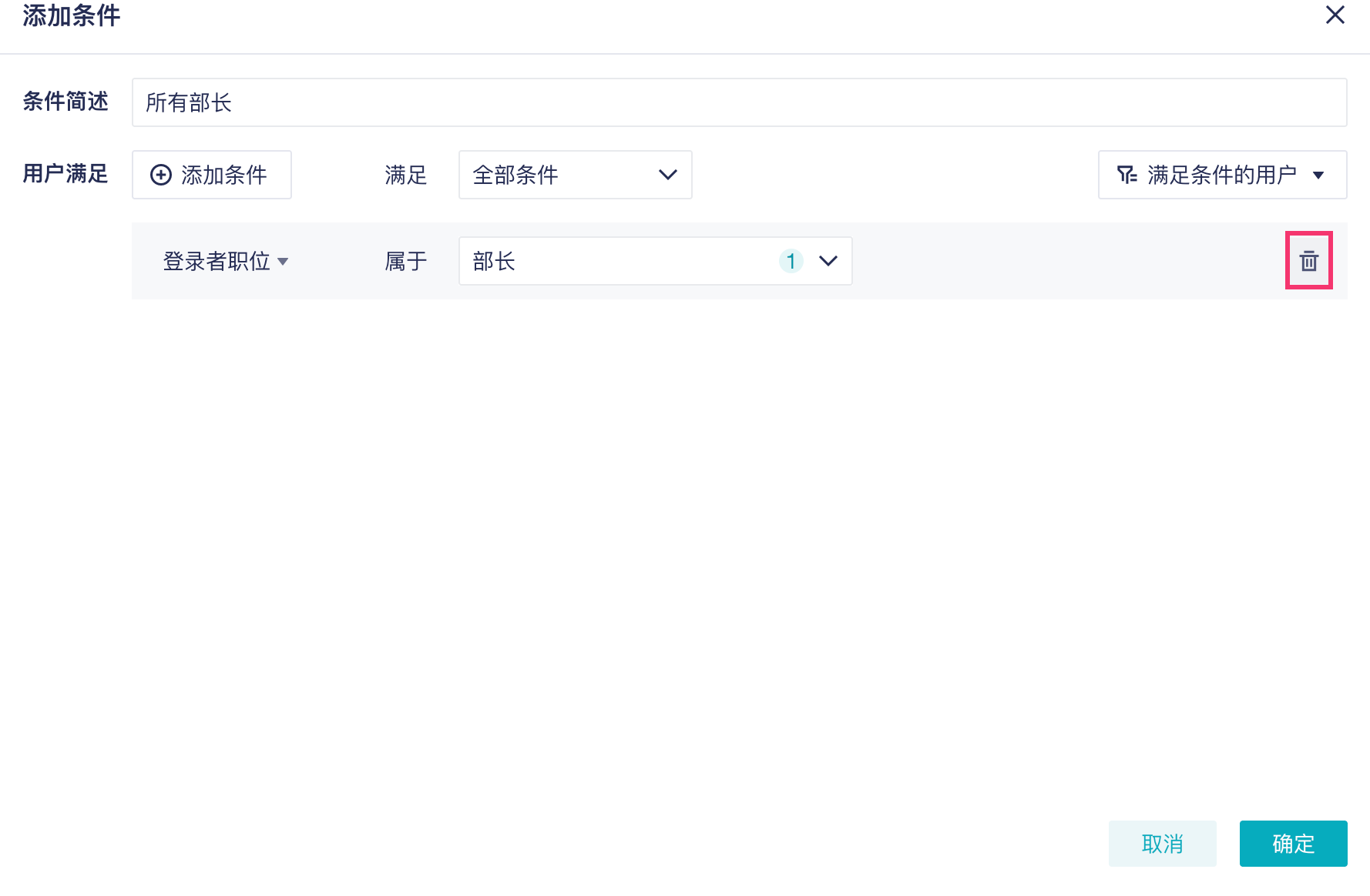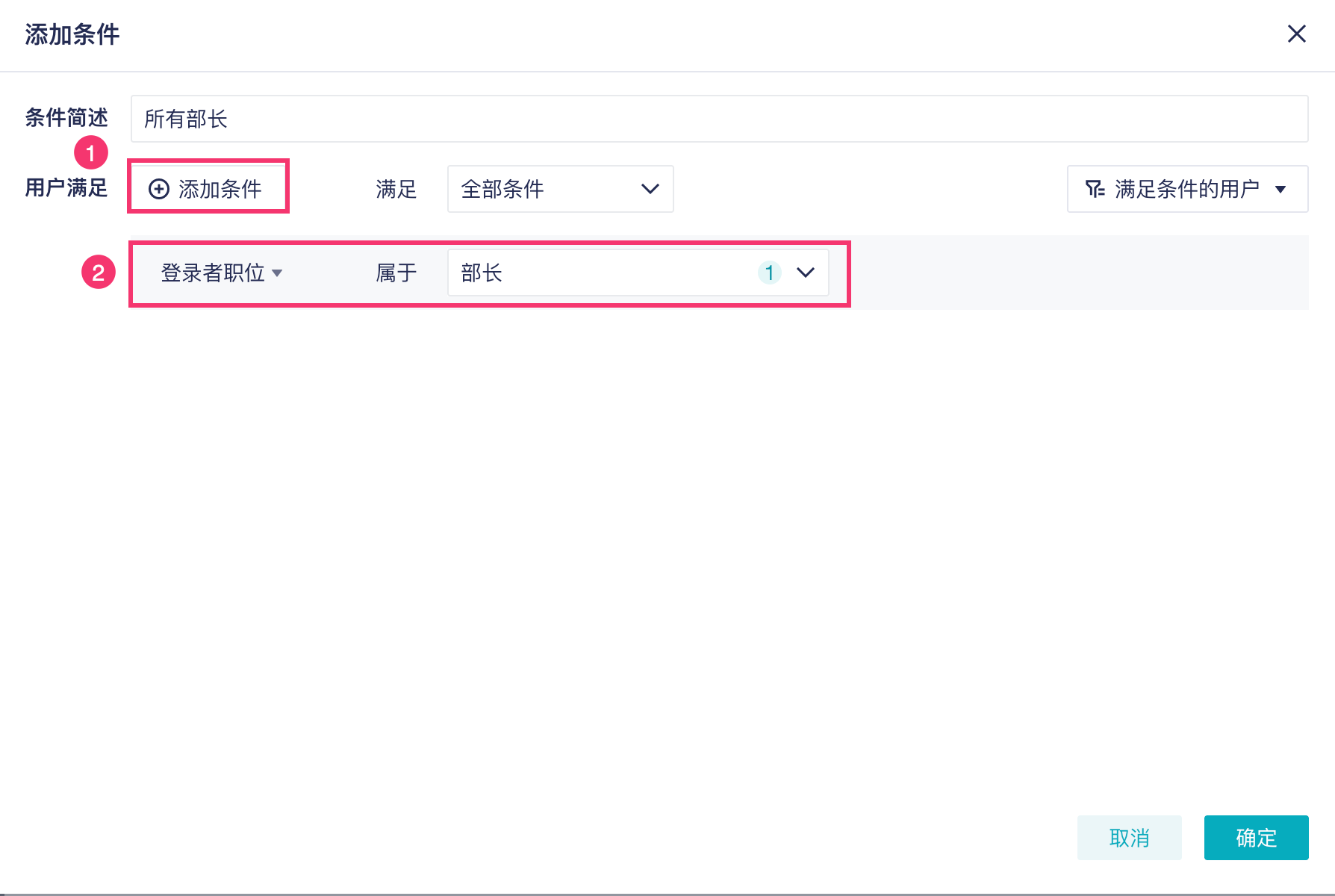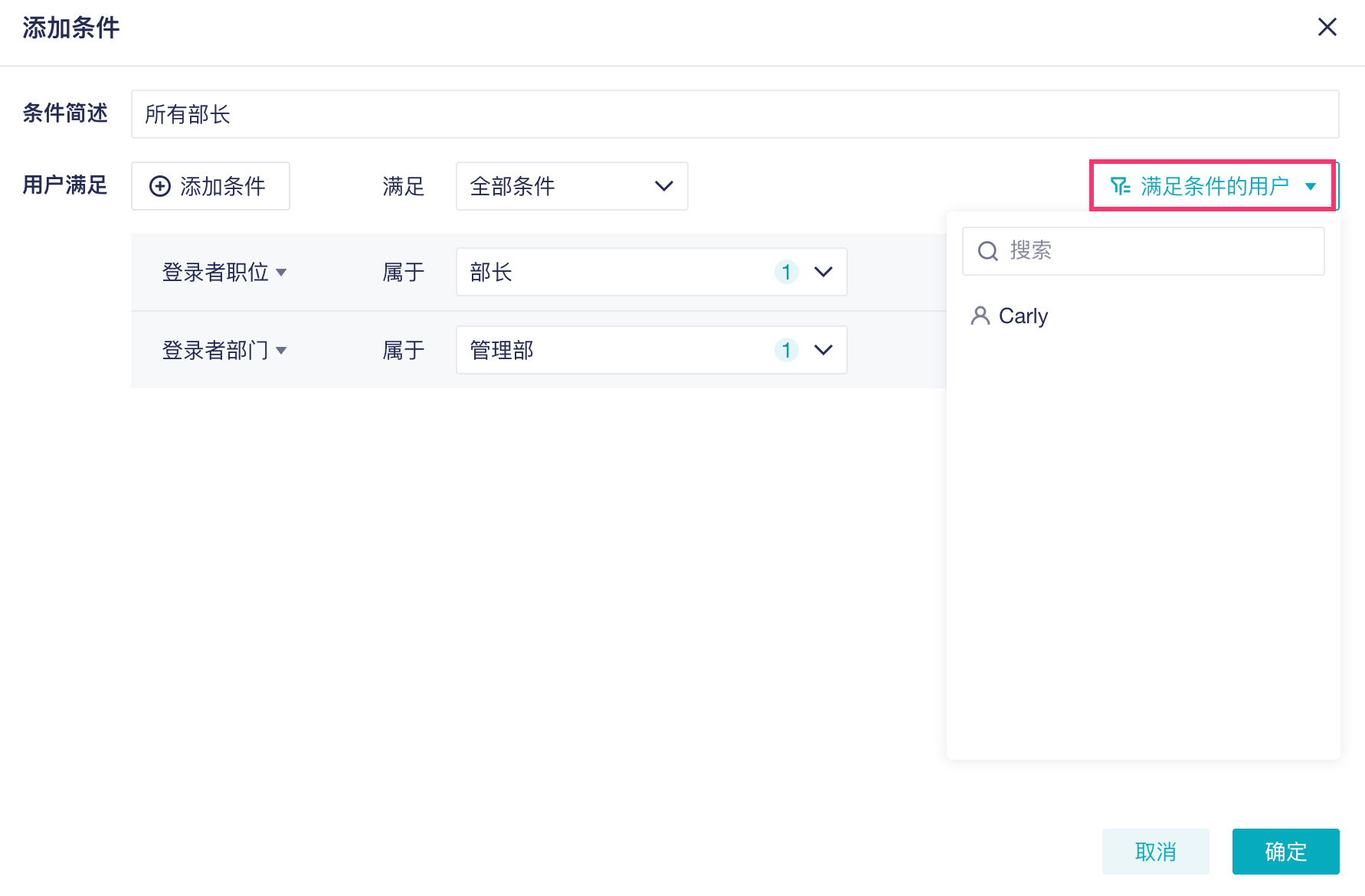 1)添加一个条件,设置为「登录者职位属于部长」。如下图所示:
