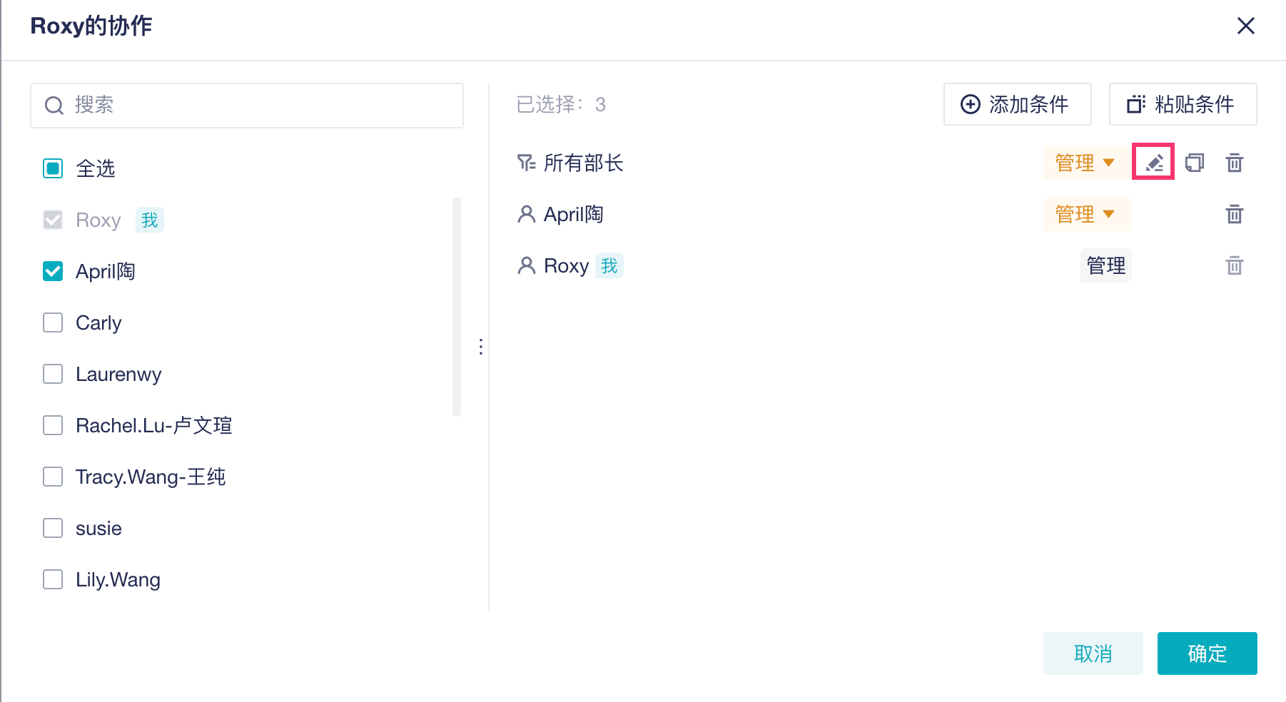 在弹窗中就添加这条权限,如需再次修改,可以点击「编辑」按钮调整条件。如下图所示: