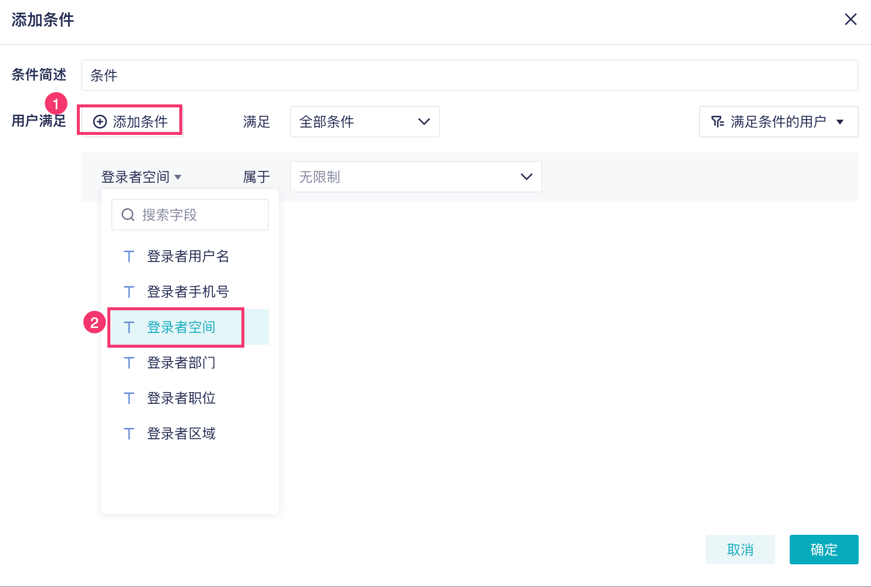 1)基于第 3 节的条件权限设置,在弹窗中选择条件为「登录者空间」。如下图所示: