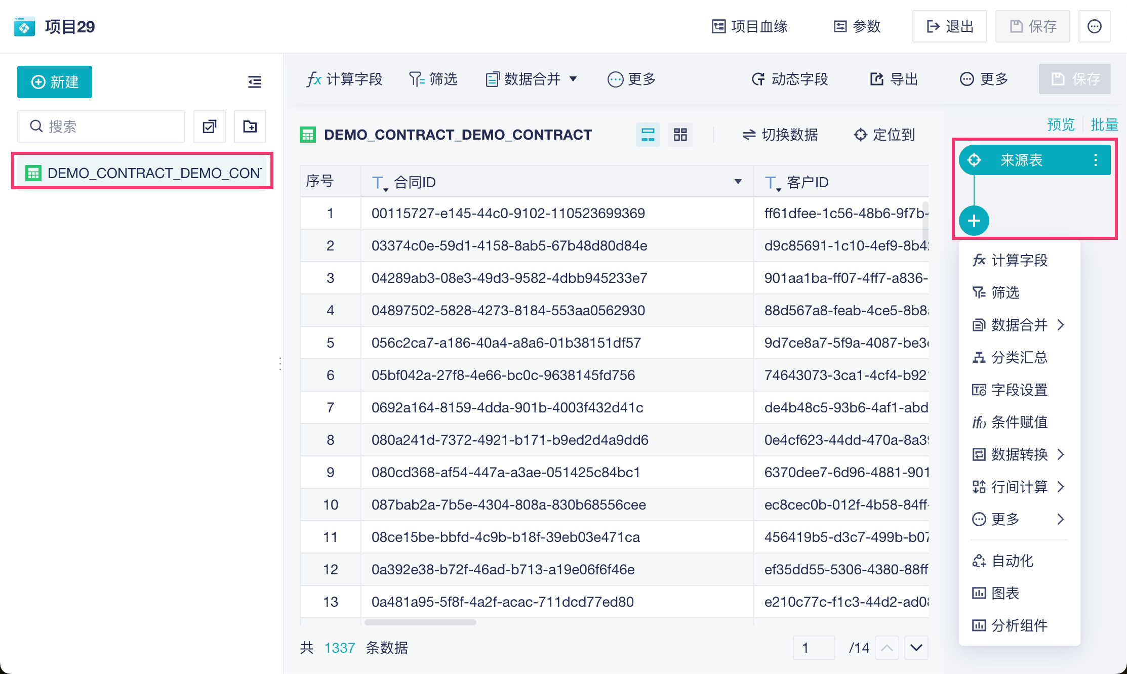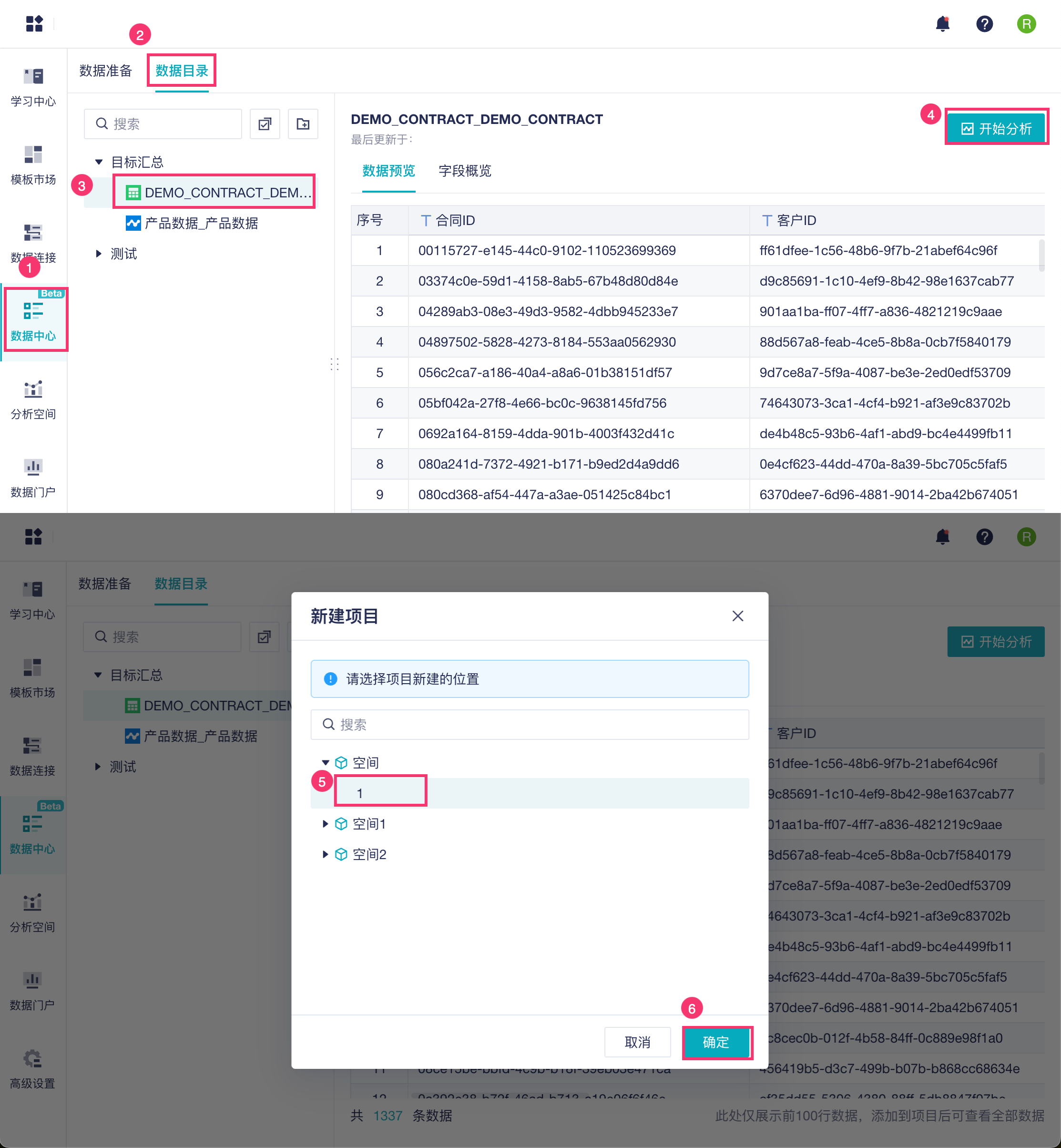 在「数据中心>数据准备」下,新建项目,并在项目编辑界面添加数据,新建分析表,如下图所示: