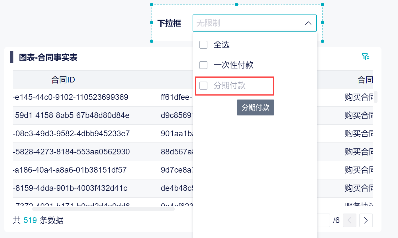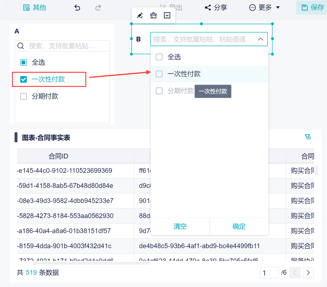 在仪表板中有多个筛选器(以筛选器 A 和 B 为例)绑定了相同的值。A 筛选器已经选择了筛选值,过滤出结果了,那么 B 筛选器只能选择已产生筛选条件的值,其余值灰化。