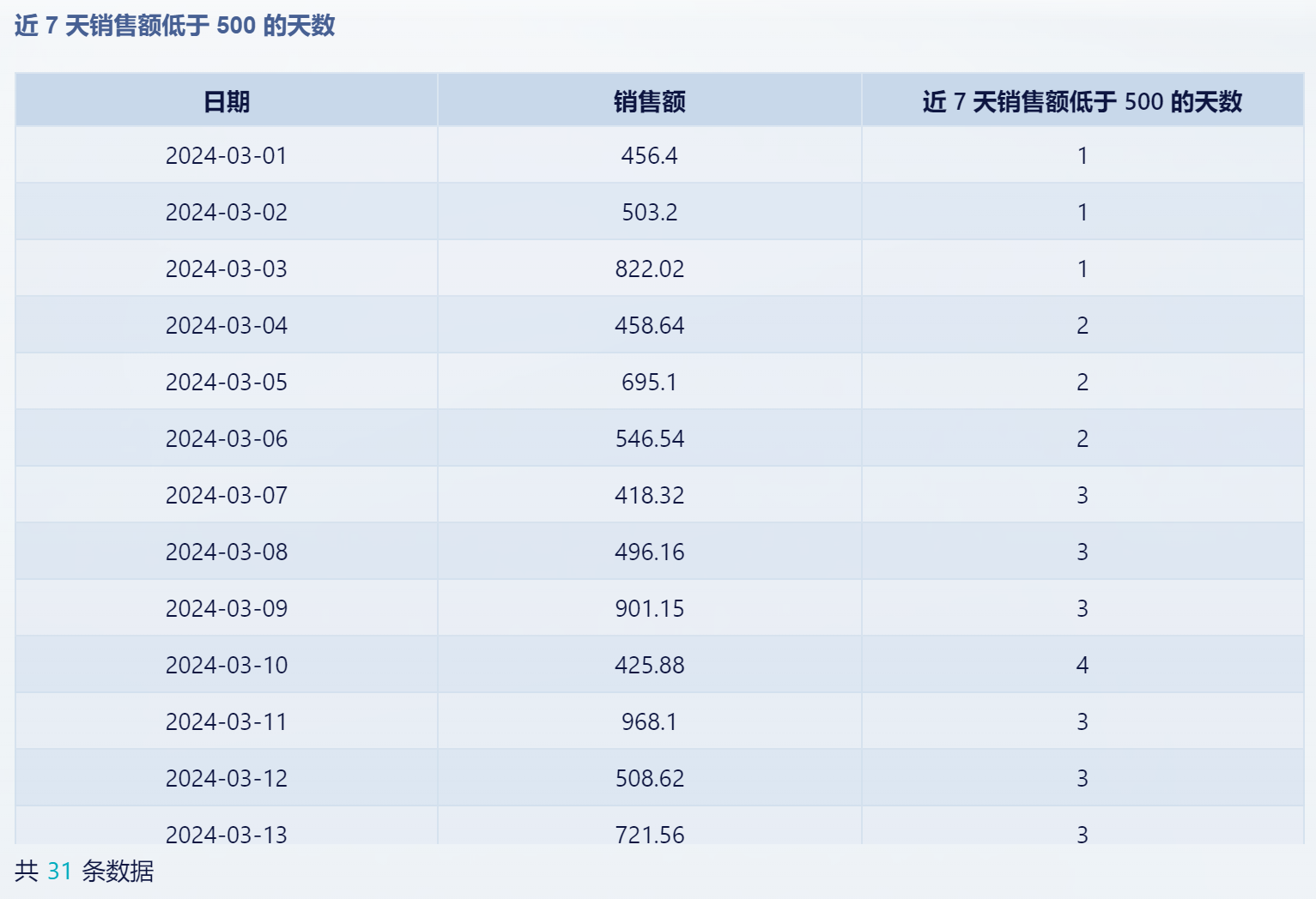 比如需要统计连续 7 天内,销售额低于 500 以下的天数有几天,若天数较多,那么就需要分析一下这一阶段的营销策略是否存在问题。