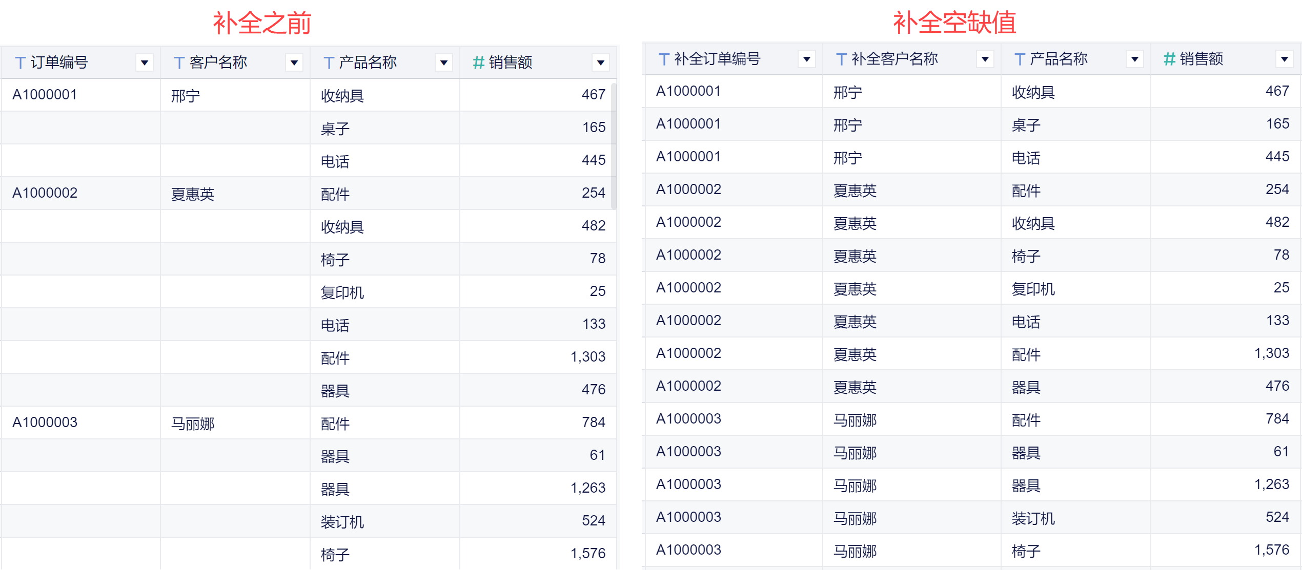从其他平台导出的销售数据中,每个订单仅有第一行展示「订单编号」和「客户名称」。可以利用「行间计算」,来补全缺失的数据。