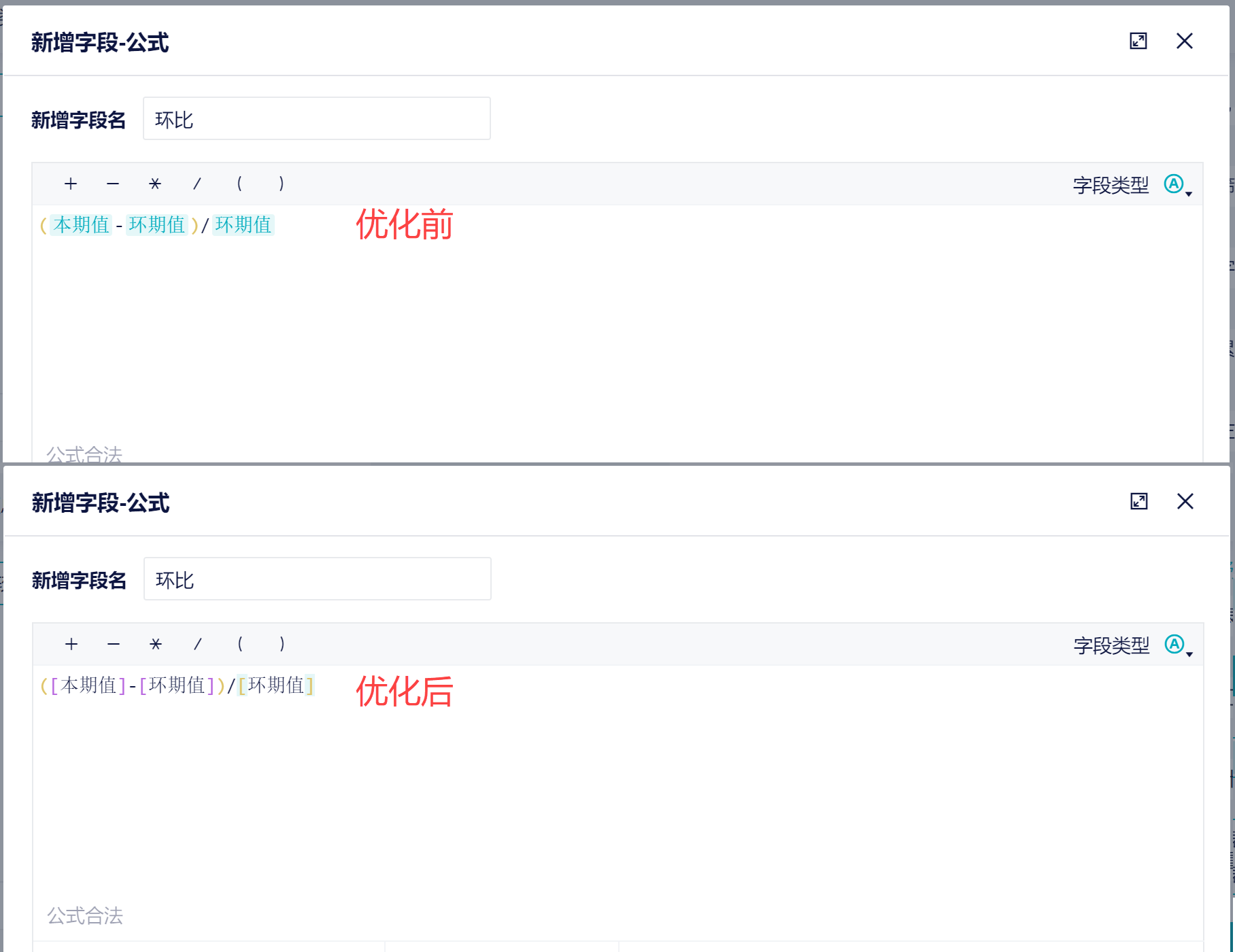 1)为提高用户编辑公式体验,对公式编辑框中字段展示进行优化。如下图所示:
